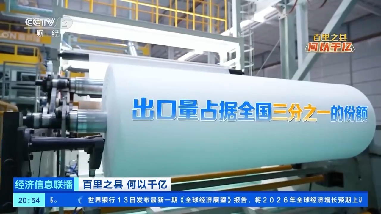 总台记者 许伟:走进这间智能化生产车间,机械臂精准运转,生产线高速飞驰,每分钟就有50米无纺布卷材新鲜下线。这样的生产节奏,在仙桃2000多家非织造布企业里,早已是常态。