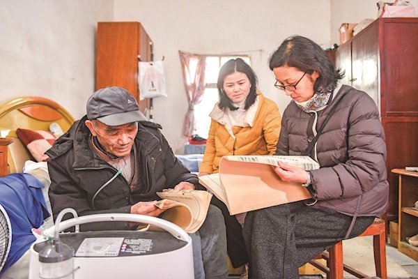 纪春田和女儿(右)、侄女翻阅族谱 楚天都市报极目新闻记者王永胜摄