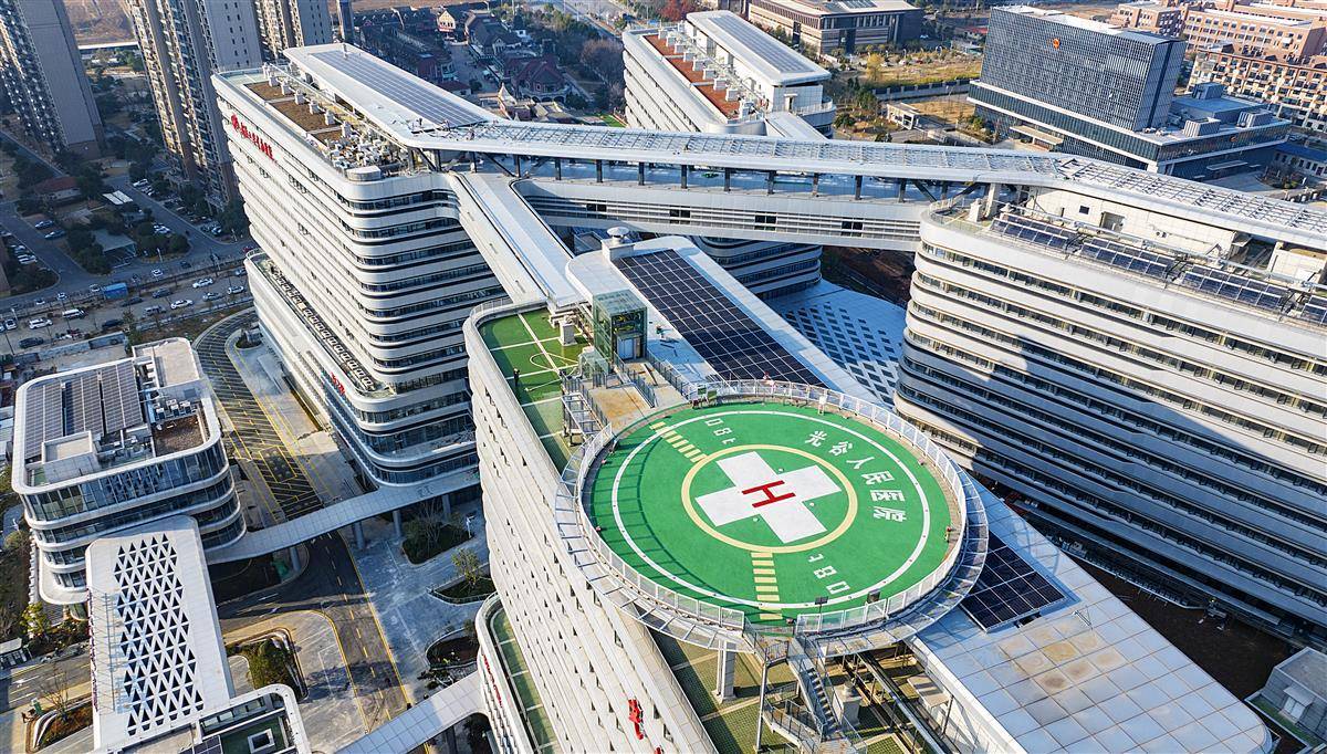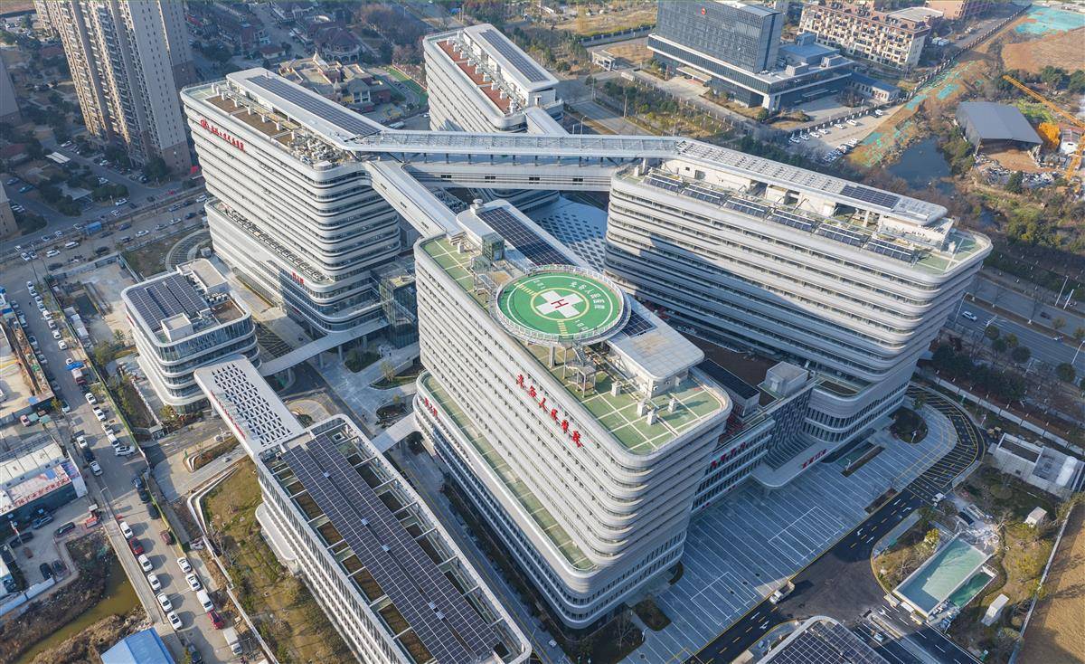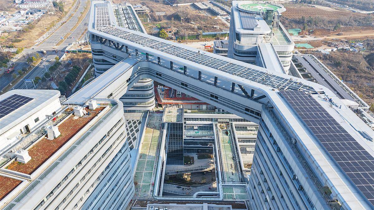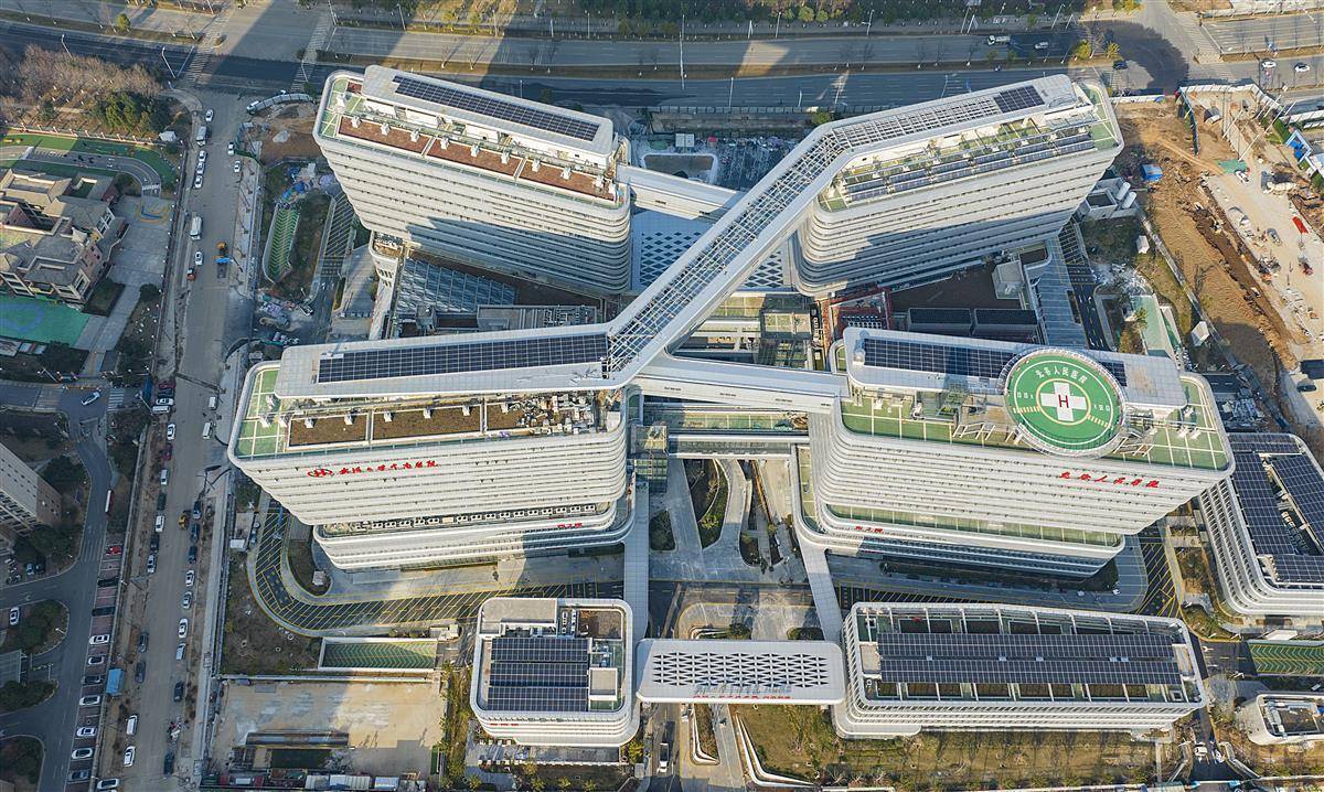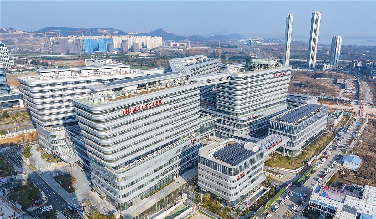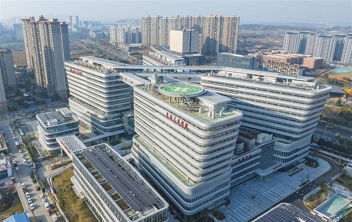 1月15日,鸟瞰位于武汉花城大道东侧的光谷人民医院项目,医院主体建筑目前已完成外立面施工,正在进行系统调试和设备安装等工作,预计今年(2026年)上半年建成投用。这是东湖高新区第一家区属公立医院,按照三级综合医院设置,总规划床位1000张,预计配备医护人员不低于1500人。