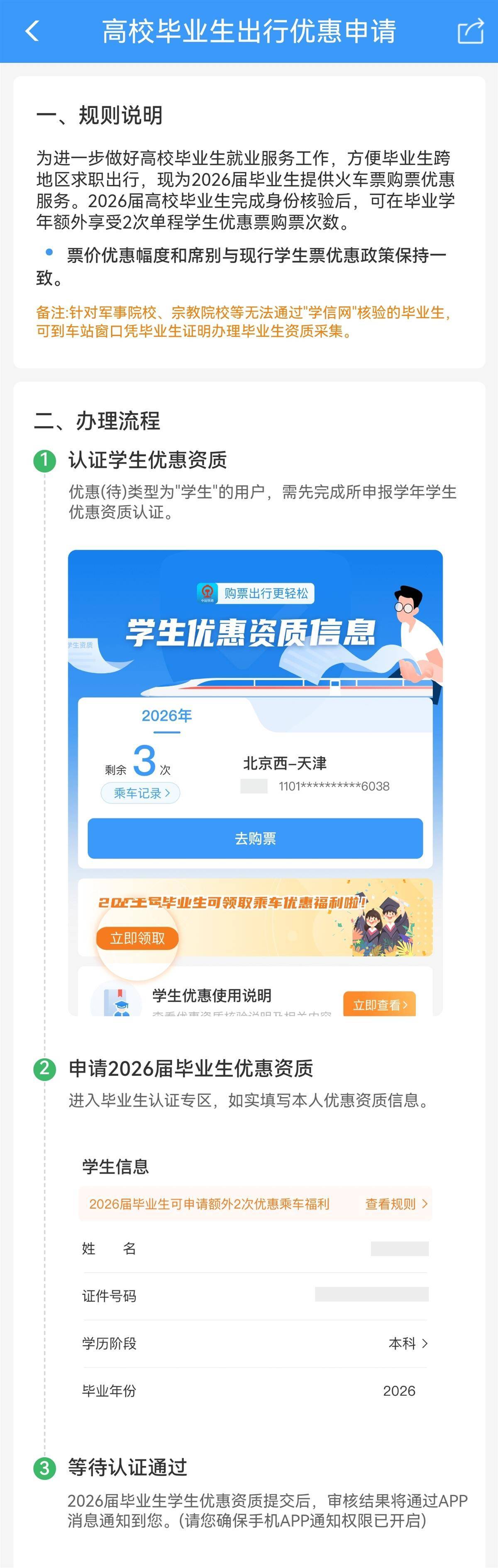 符合条件的学生旅客可通过铁路12306客户端优惠资质专区申请办理毕业生优惠资质核验,未在“学信网”核验的部分高校和军事院校、宗教院校的2026届毕业生,可到车站窗口凭毕业生证明线下办理资质采集核验,完成核验后本学年可享受的单程学生优惠票购票次数增至6次。