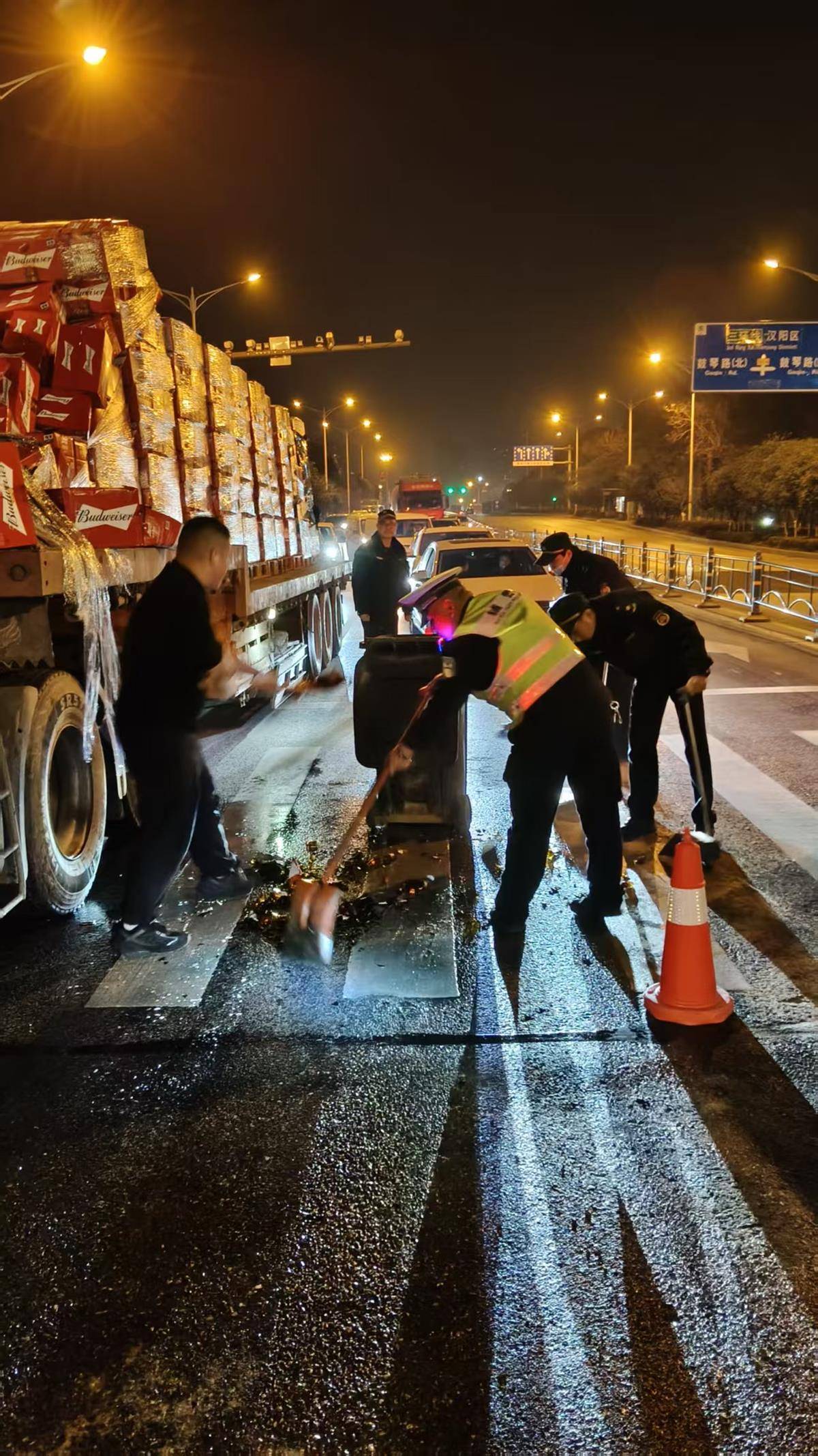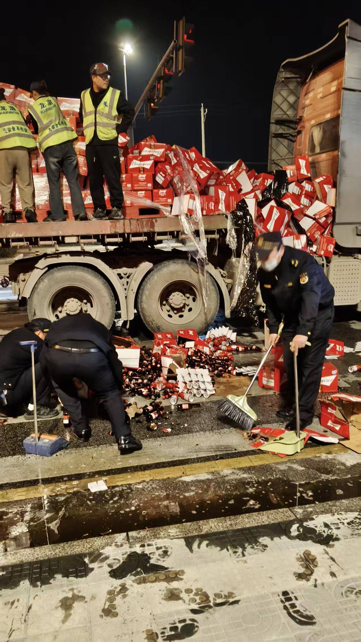 湖北日报讯(记者张竞恒、通讯员严娟娟、沈黎)1月15日晚7时40分,夜色渐深,武汉市蔡甸区新天大道上车流如织。在中法生态示范城第一初级中学红绿灯处,一场突发状况打破了夜晚的平静:一辆满载啤酒的货车因紧急刹车,车上百余箱啤酒瞬间散落一地,玻璃碎片与酒液四处飞溅,道路迅速陷入拥堵。