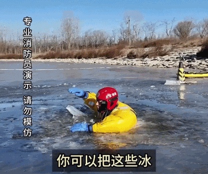 如果对自身能力和冰面厚度有专业判断,救援时要匍匐前进,将木板、梯子等铺在冰面上增加身体与冰面的受力面积,减少压力,防止冰面破裂或被拖入冰窟。