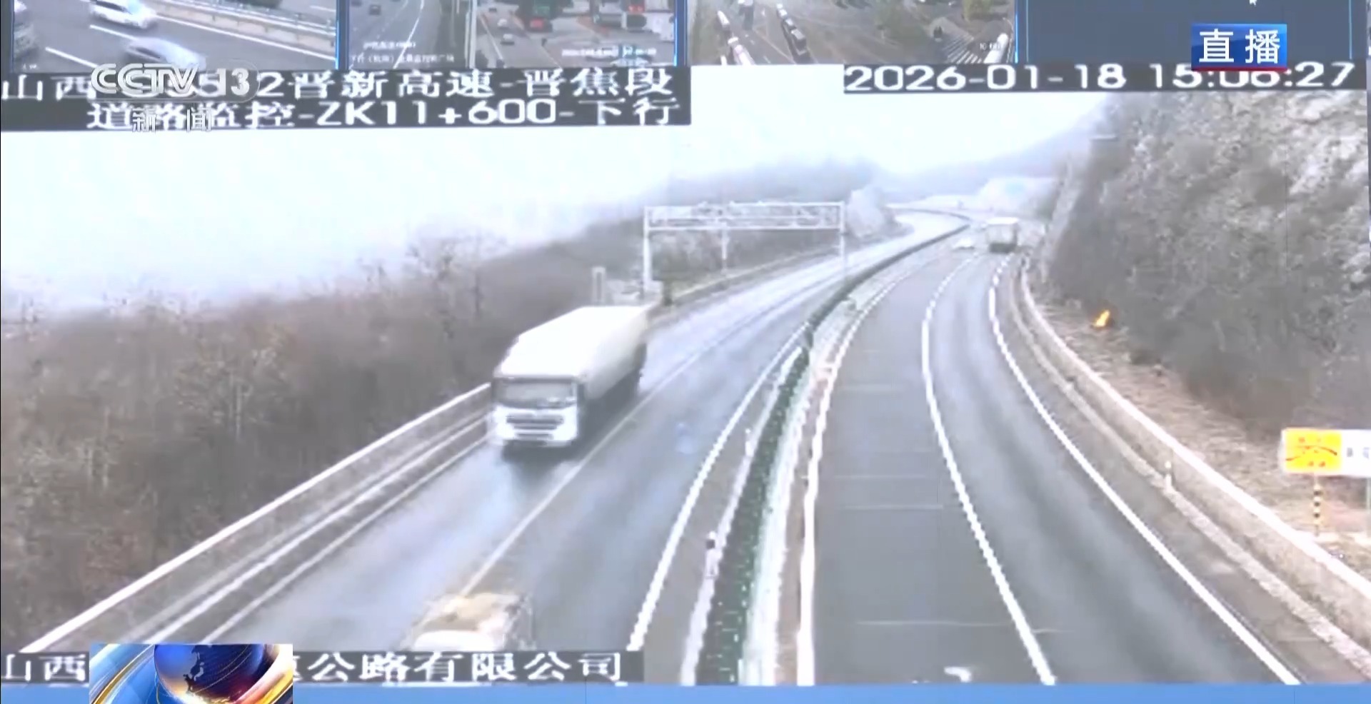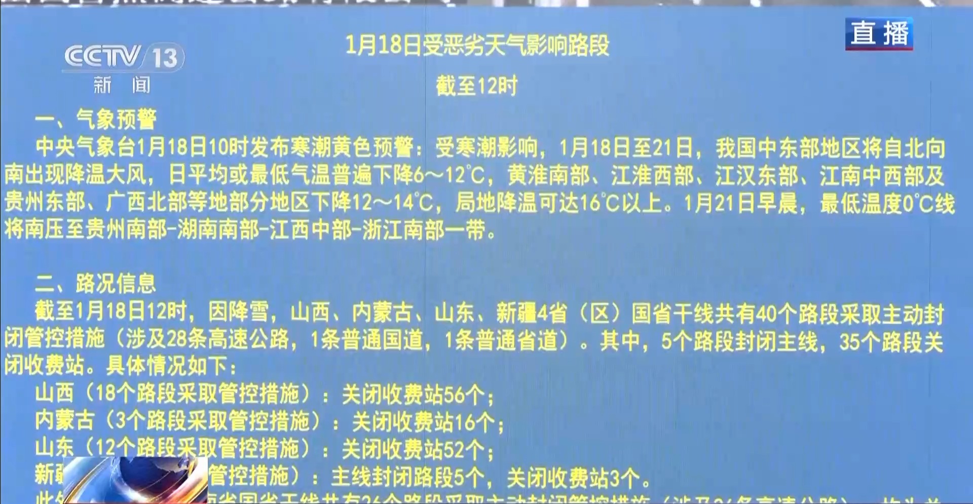总台央视记者 陈俏:我们在交通运输部了解到的最新情况,截至今天中午12时,因降雪,山东、山西、内蒙古、新疆4省(区)的国省干线,仍然有40个路段采取主动封闭管控措施。