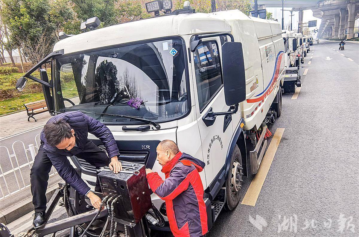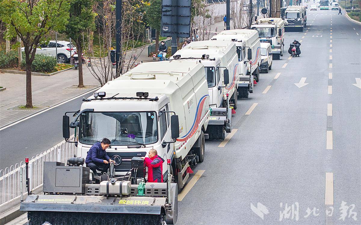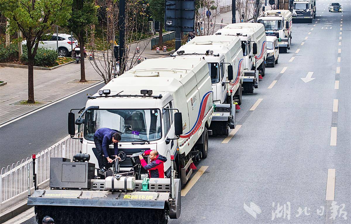 这些新能源环卫车配备了专业的除雪铲、撒布机等装置,能够高效清理道路积雪,播撒融雪剂,保障道路畅通。(湖北日报全媒记者 朱熙勇 摄)
