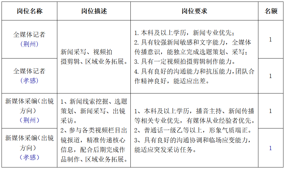根据事业发展需要,荆楚网汉江分公司拟面向社会公开招聘工作人员4名。现就相关事项公告如下: