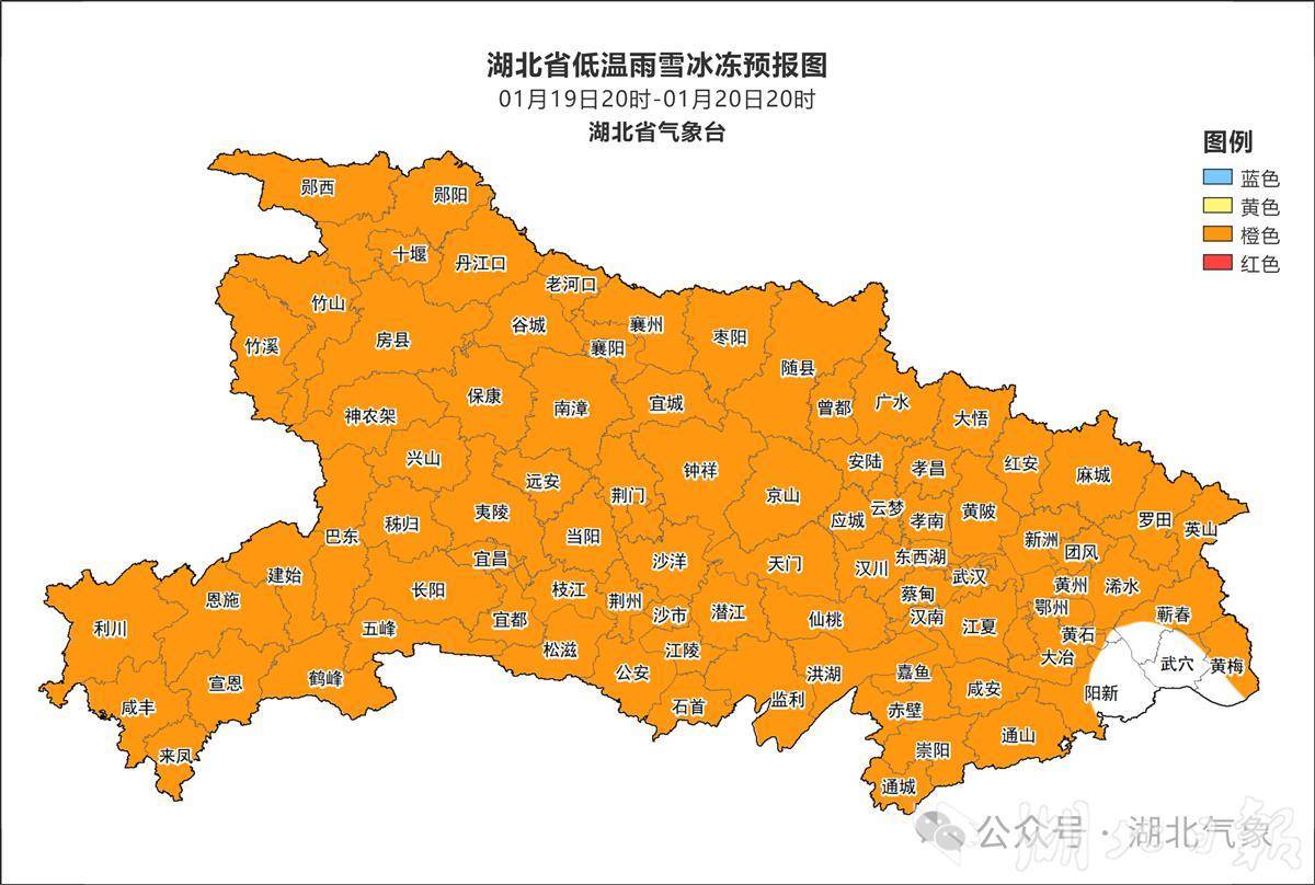 15时38分,省气象台发布低温雨雪冰冻橙色省级预警:预计19日20时至20日20时,十堰、襄阳、神农架、随州、恩施、宜昌、荆门、孝感北部、黄冈北部等地将出现积雪,其中荆州、孝感南部、天门、武汉、鄂州、黄石中西部、黄冈南部、咸宁由雨逐步转为冻雨、雪(冰粒),上述地区最低气温≤0℃。