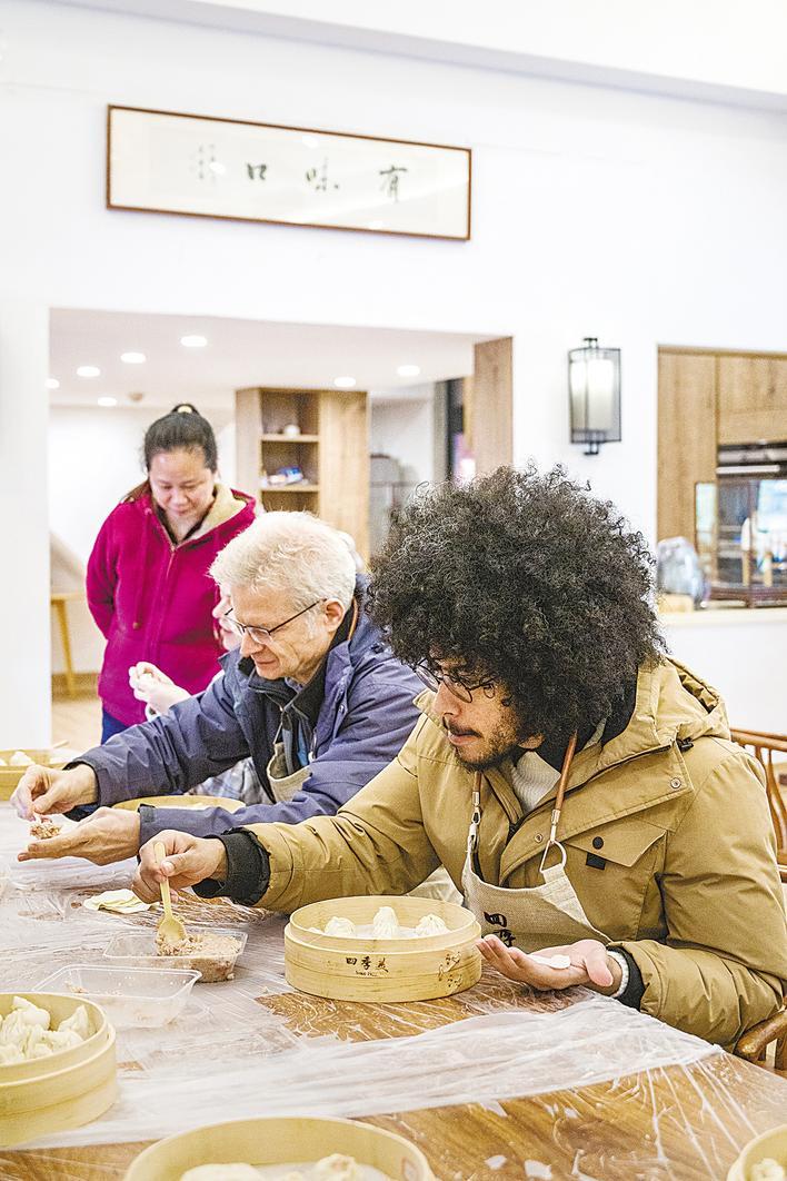 1月16日,外国专家在武汉老字号“四季美”学习制作汤包。