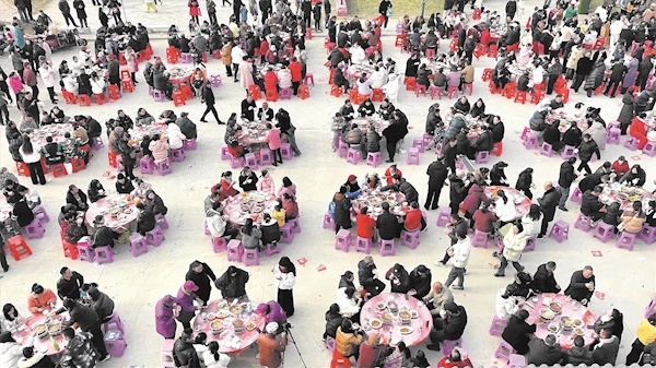 1月17日,荆州市公安县夹竹园镇桥岭村人声鼎沸、香气扑鼻,一场热闹非凡的杀猪宴在此开席,千余名父老乡亲齐聚一堂,免费共享家乡风味。现场烟火气十足,两头肥猪新鲜现宰,100多斤鱼糕、600斤牛肉及30桶罐装牛肉轮番入锅,滋滋声响中,85桌宴席迅速摆满佳肴,为乡亲们添了年味儿,更让返乡村民感受到家乡的温情。