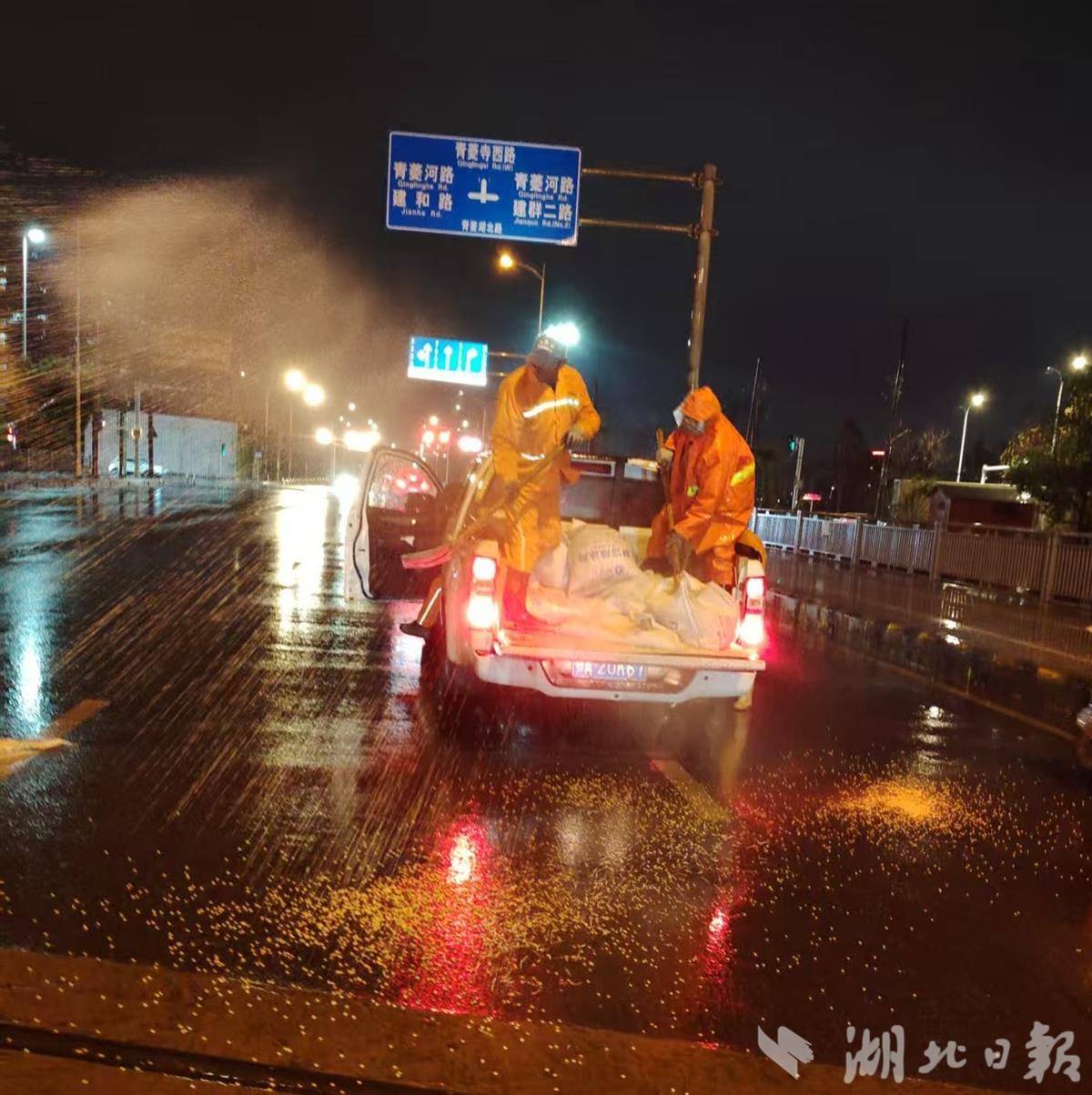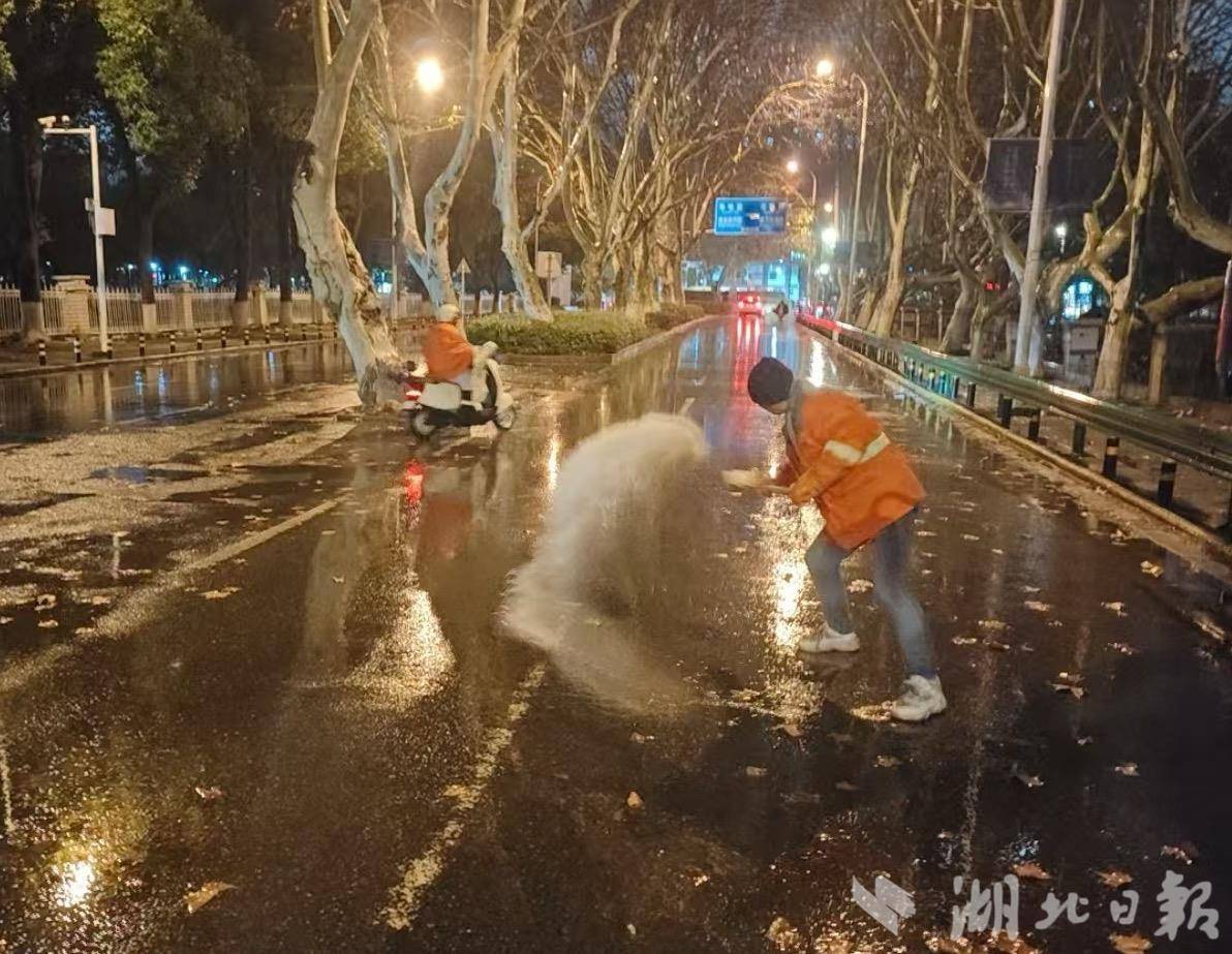 湖北日报讯(通讯员朱仙红、谢卓维)1月19日晚,武汉气温降至零下,夜间低温结冰风险加剧。晚间七点,洪山区城管执法局多辆融雪剂撒布车整装出发,开启机械化作业模式,橘红色的作业车辆在白沙洲大道、南湖大道、丁字桥南路等主次干道预撒融雪剂,伴随着机械的轰鸣声,融雪剂被均匀地播撒在路面上,有效抑制冰层形成。