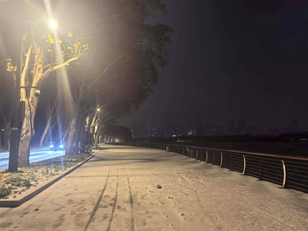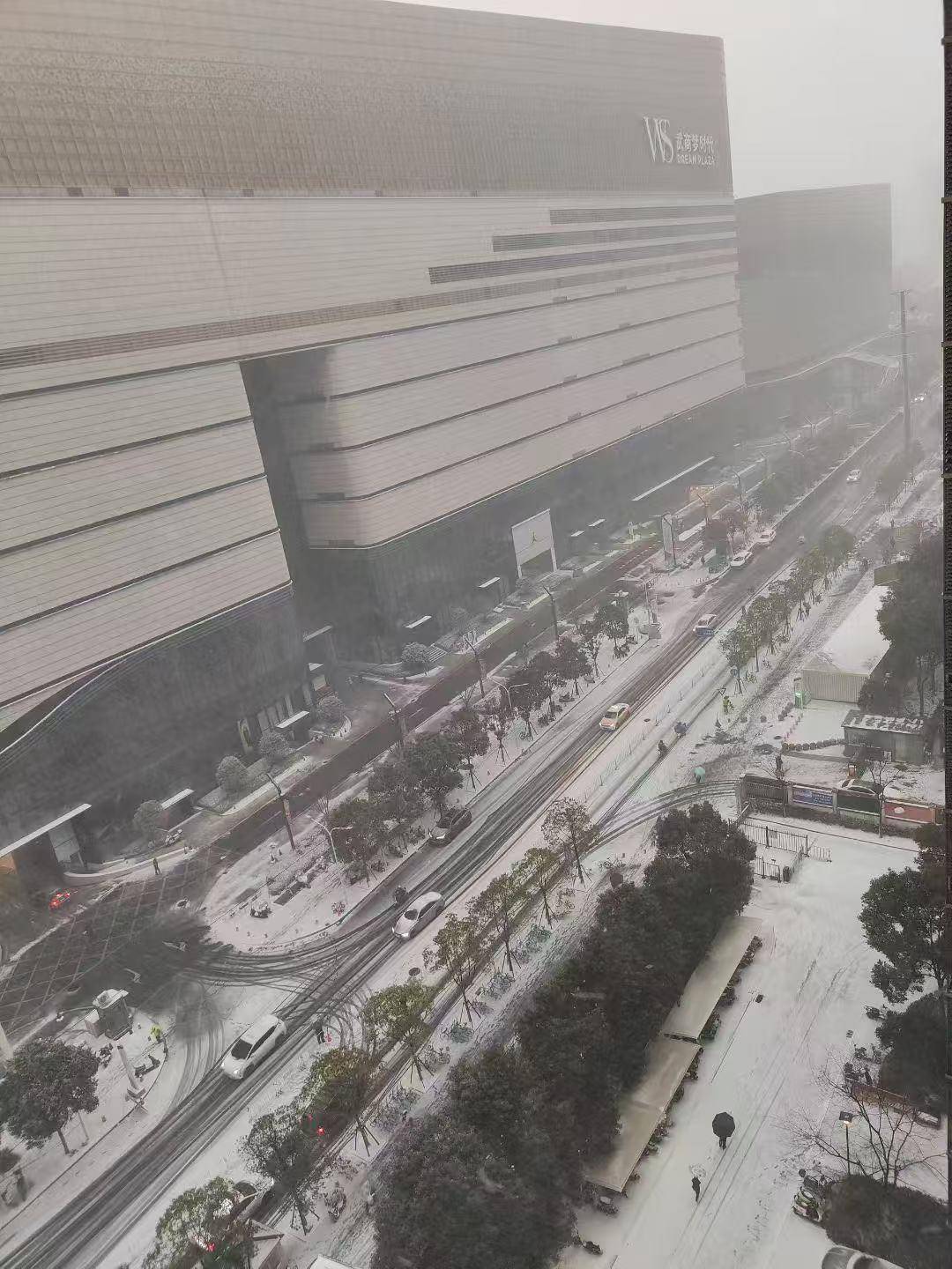 武珞路梦时代一带,路面已有积雪。(市民 王晓宇 摄)