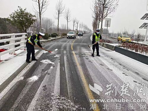 1月19日,老河口市公安局交管大队民警雪中执勤,清扫辖区积雪路段。丁均睿 摄