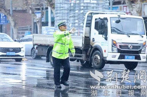 1月19日下午,襄阳市公安局交管支队58岁民警程宝群风雪中在樊城区清河路上疏导车流近2小时。梁政 摄