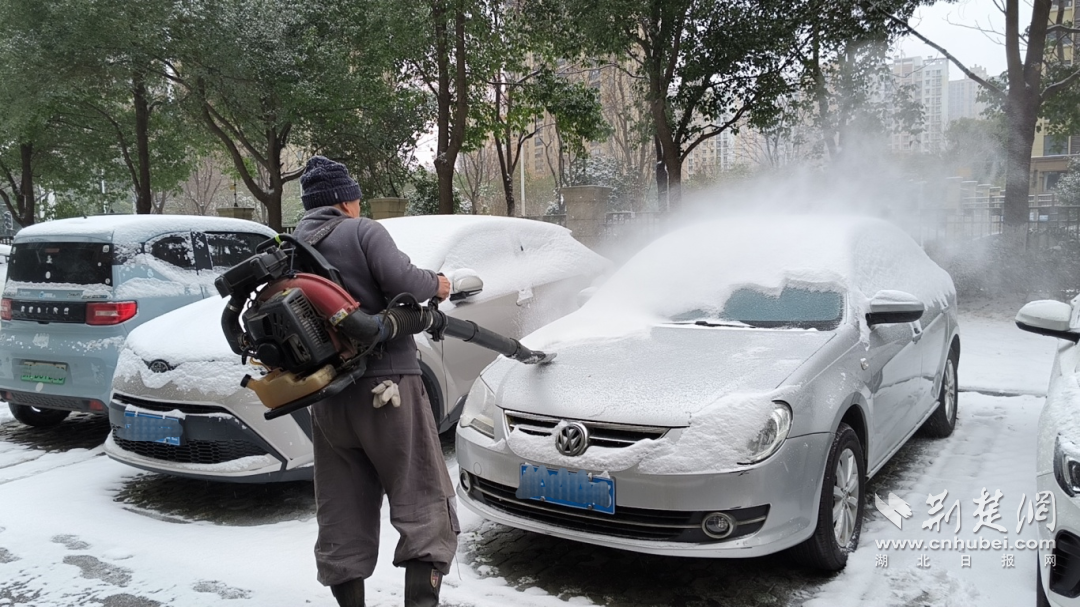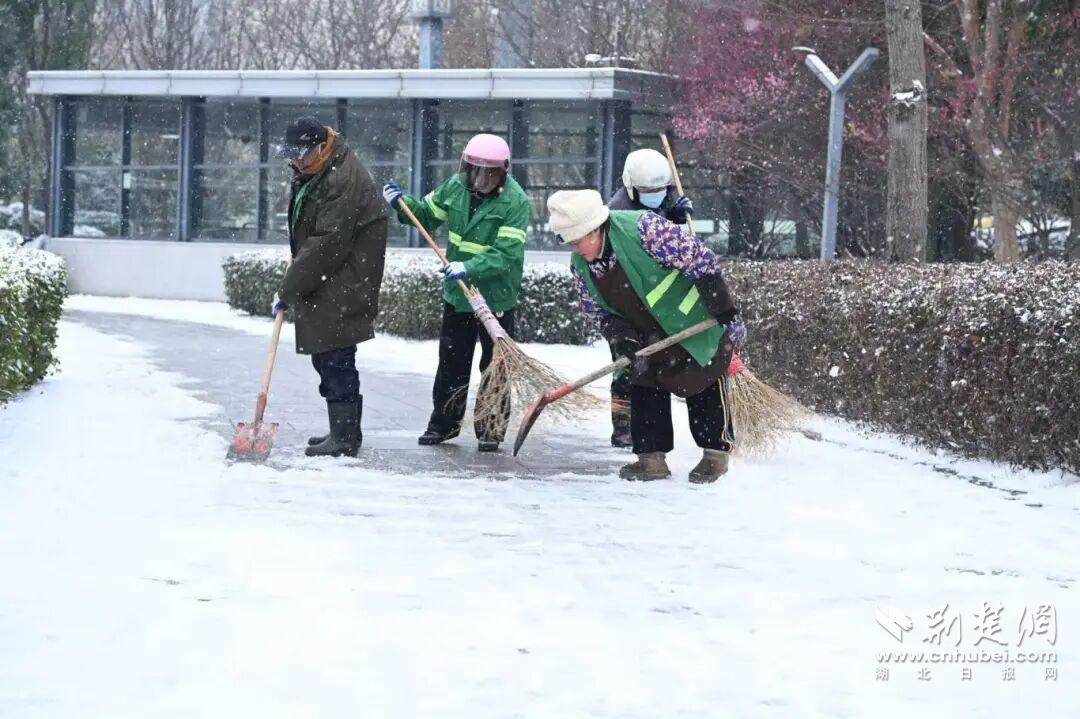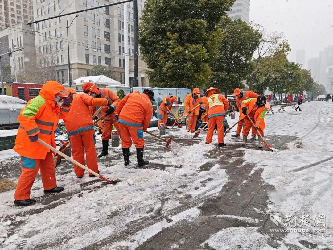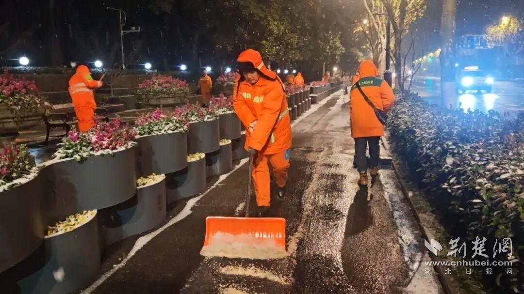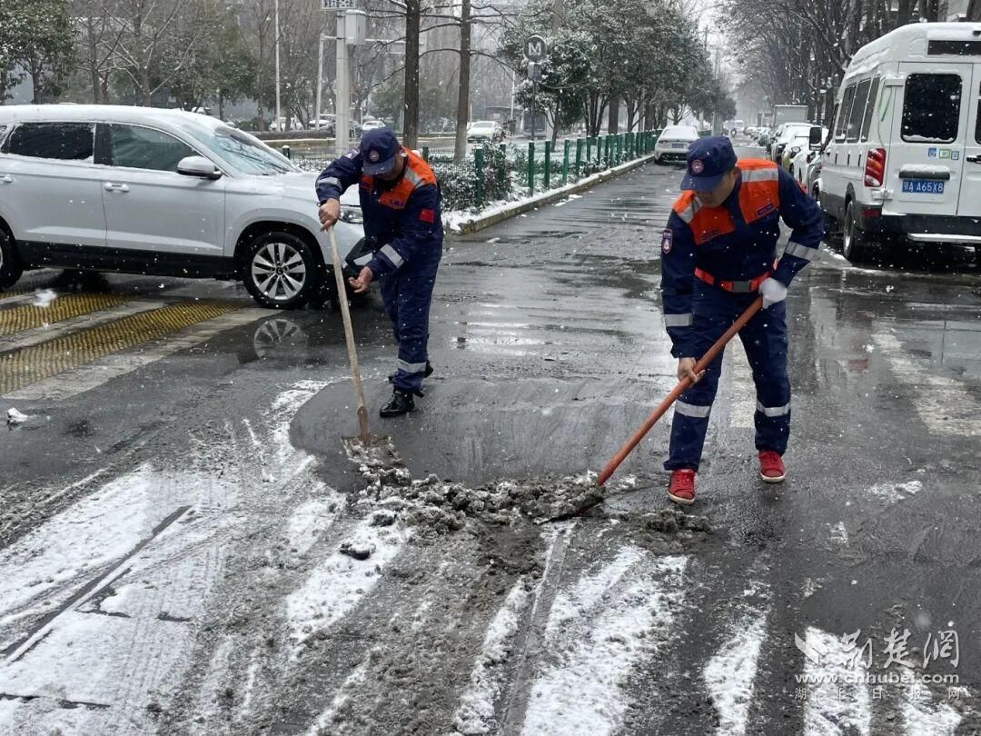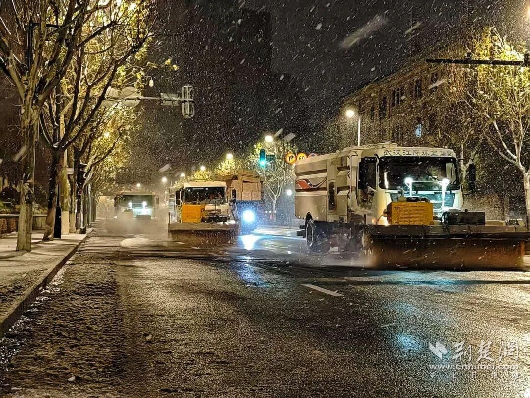 江岸区城管、环卫部门闻令即动与风雪竞速。自午夜雪落起,25台雪滚车、12台雪铲车即在全区主干道、高架桥展开多轮循环作业,确保“雪落即清”。