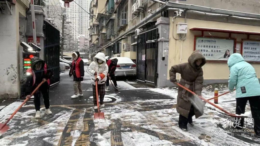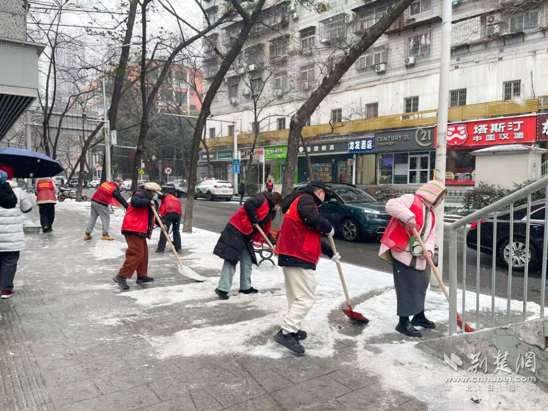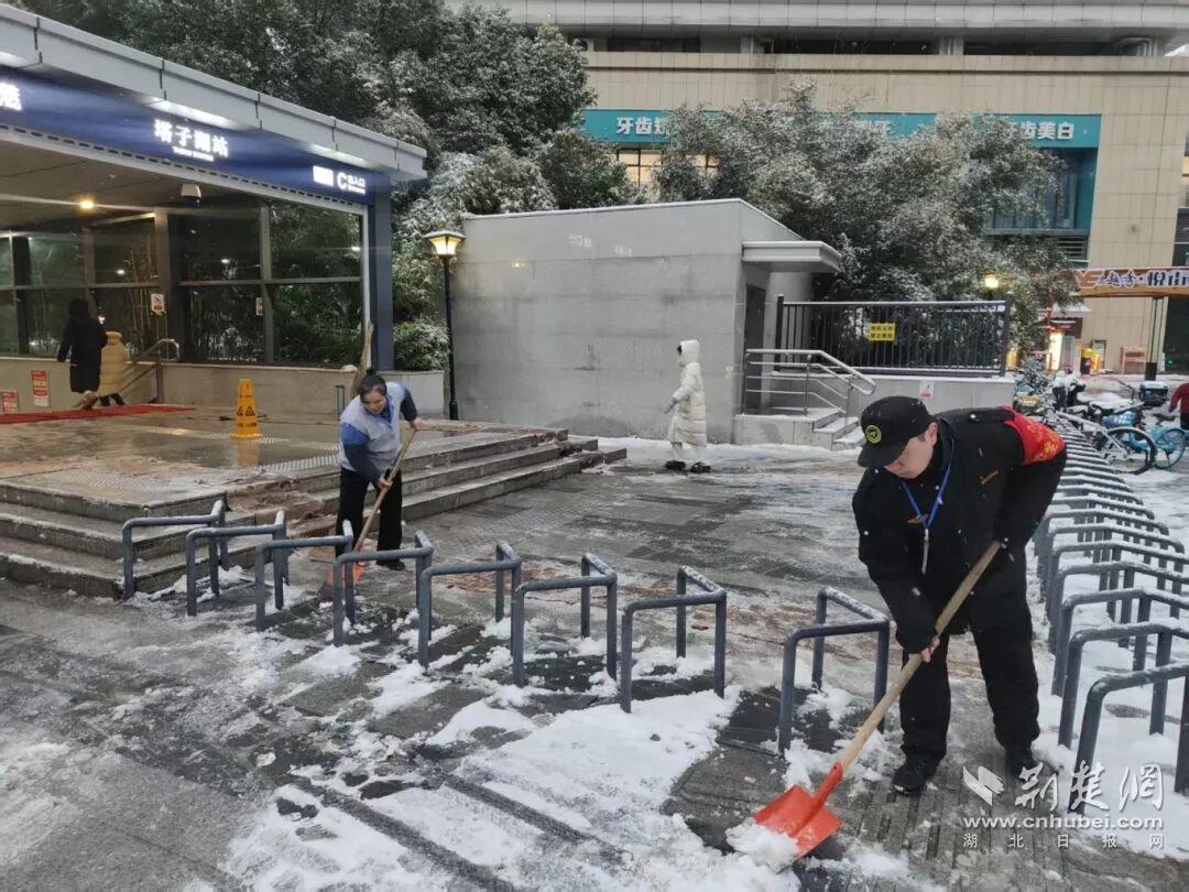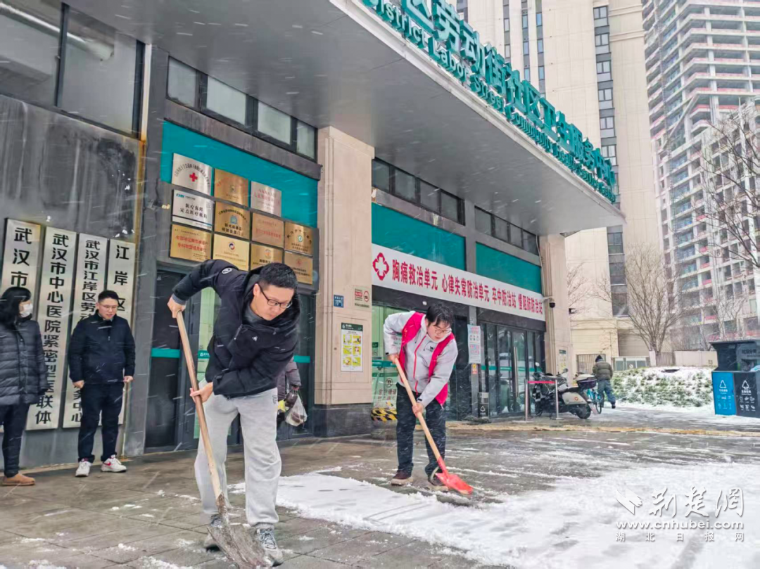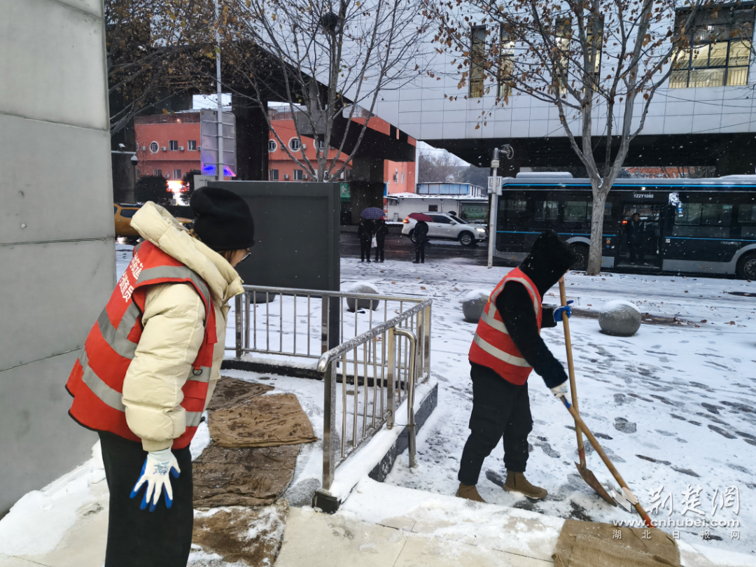 塔子湖街道在地铁口等人口密集区域铺设防滑垫、铲冰除雪,确保居民出行安全。