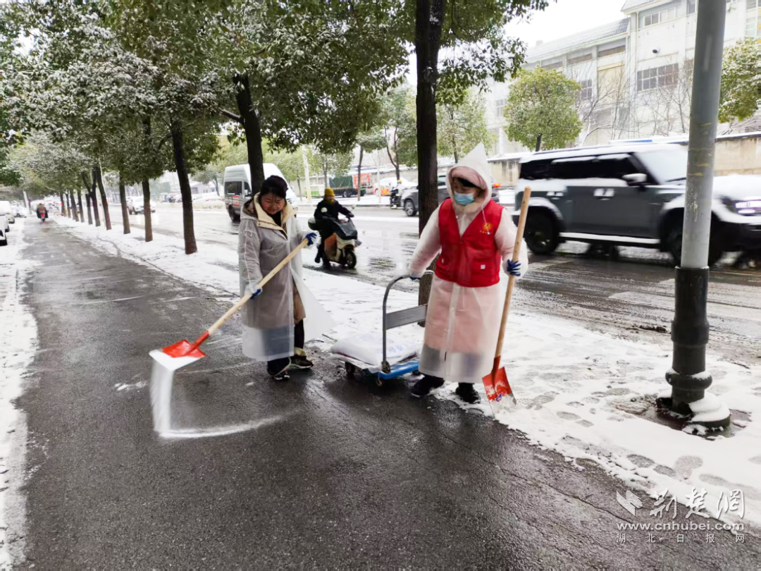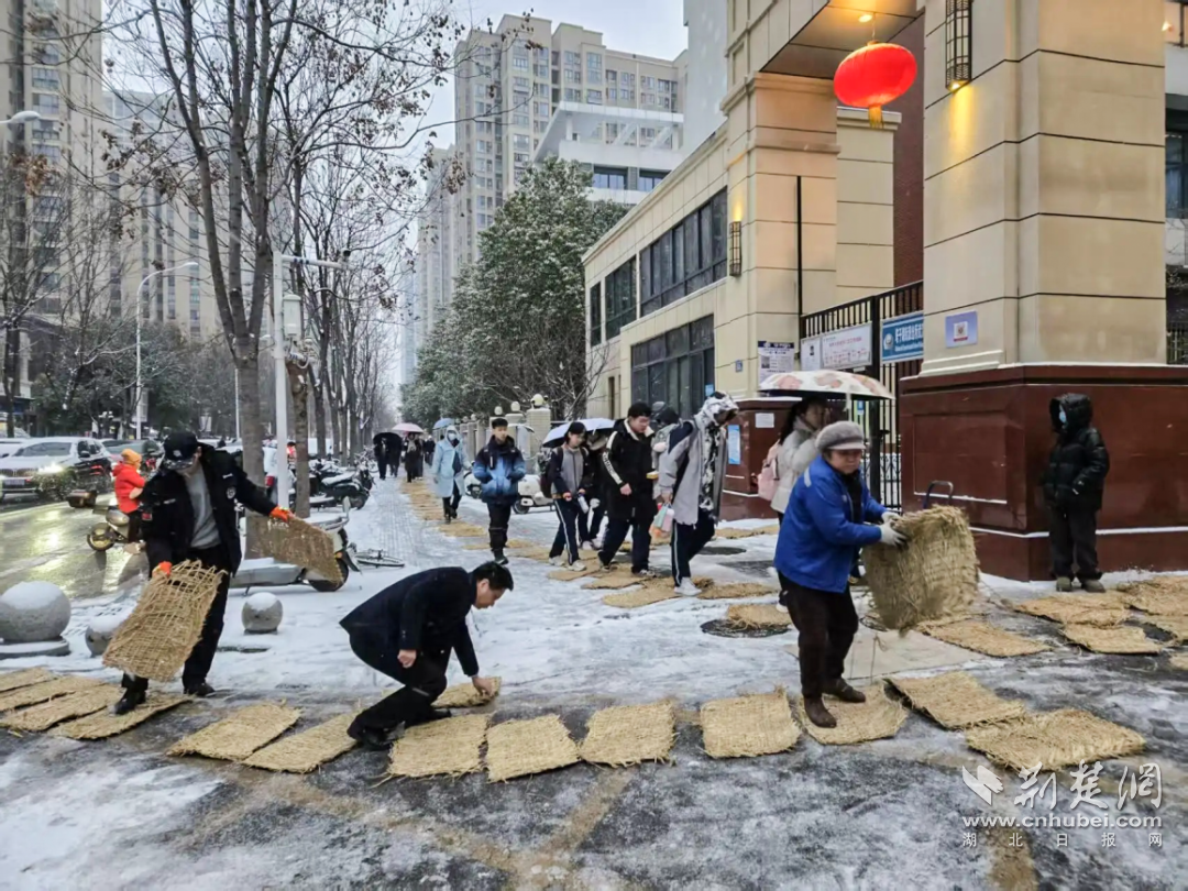 后湖街道在主干道及重点区域撒融雪剂、铺设防滑垫,守护居民出行便利。