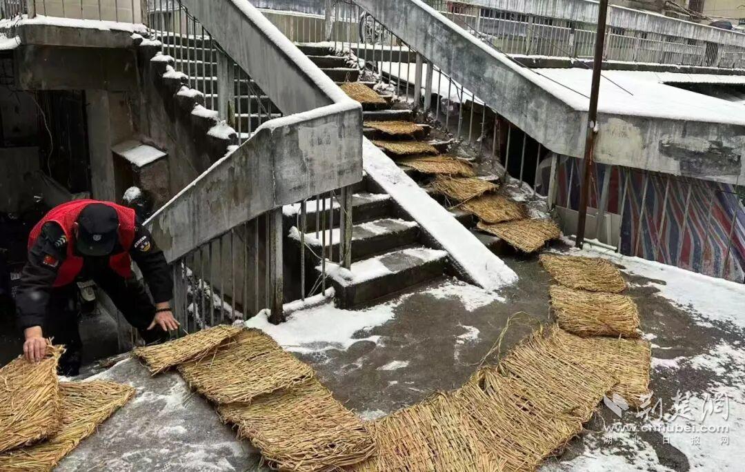 数百名环卫工人与执法队员顶寒风、彻夜无休,手持铁锹扫帚清理人行道、公交站台残雪,并在人行天桥、公厕出入口等重点区域铺设麻袋、草垫6000余条,为市民开辟出一条条安全暖心的通道。