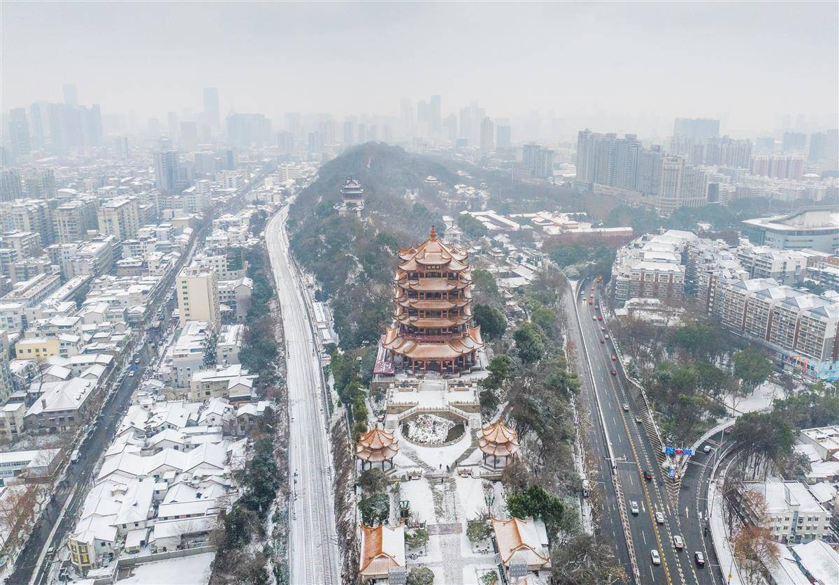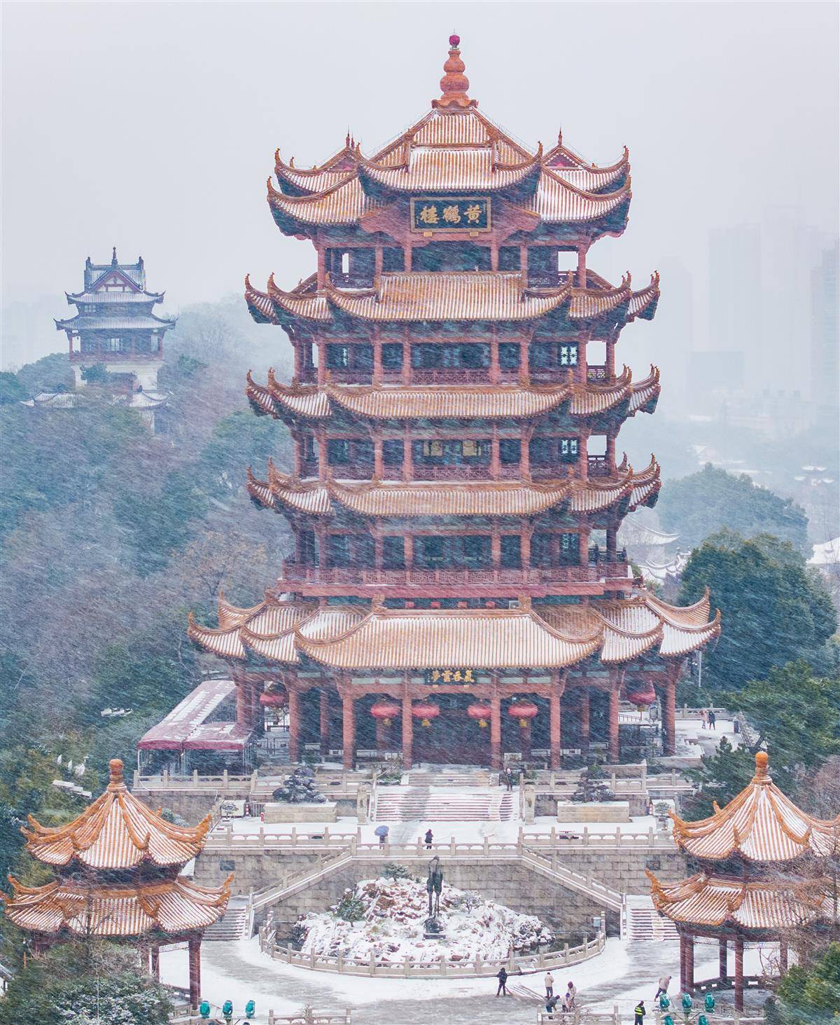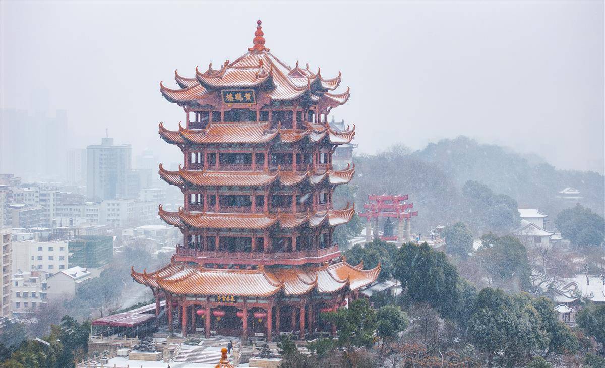 1月20日清晨,大雪中的武汉黄鹤楼。(湖北日报全媒记者 柯皓 摄)