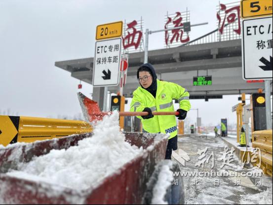 公司管辖的各收费站全体在岗职工迅速集结,拎起扫帚、铁锹投入清雪战斗。按照“先车道、后广场,先主路、后连接线”的原则,大家分工明确、默契协作:一组人员重点清理收费车道、岛头及广场积雪,保障车辆进出站无阻碍;另一组人员延伸作业范围,对收费站与地方路连接线的积雪结冰路段撒布融雪剂、开展集中清扫,从源头遏制二次结冰隐患。1月20日清晨4点,经过近五个小时的“浴雪奋战”,各收费站收费车道积雪基本清除完毕,但降雪持续不停,公司“雪停路净、通行无阻”的保畅攻坚仍在继续。