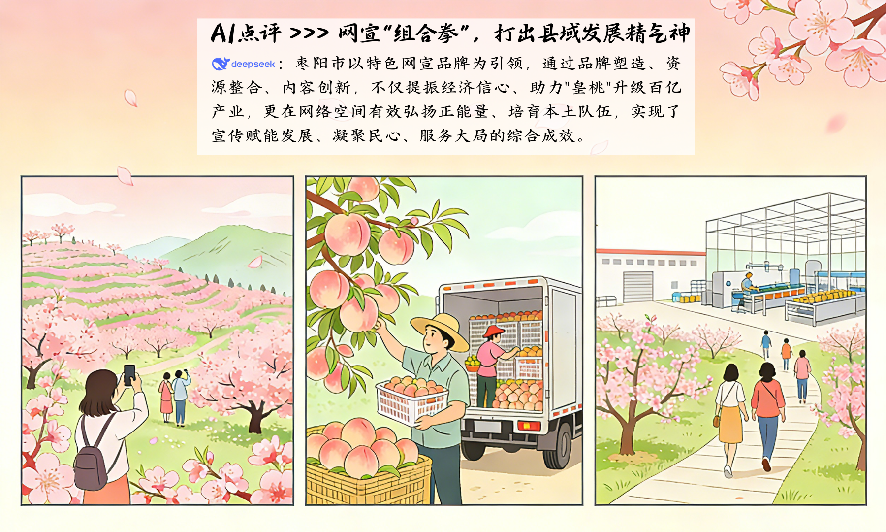 枣阳策划推出“皇桃传汉韵”等系列网络主题宣传,结合汉光武帝刘秀故里背景,紧扣“皇桃”种植各环节,制作百余部宣传短片。同时,动员网络大V和本土桃农携手,以新媒体平台为阵地讲述“皇桃故事”,让枝头鲜果与千年文脉通过小屏走向大众,相关话题全网传播量超1.5亿次。同步开展“醉美枣阳 桃印帝乡”短视频创意大赛及直播活动,进一步点燃全民参与热情,让品牌实现破圈传播。