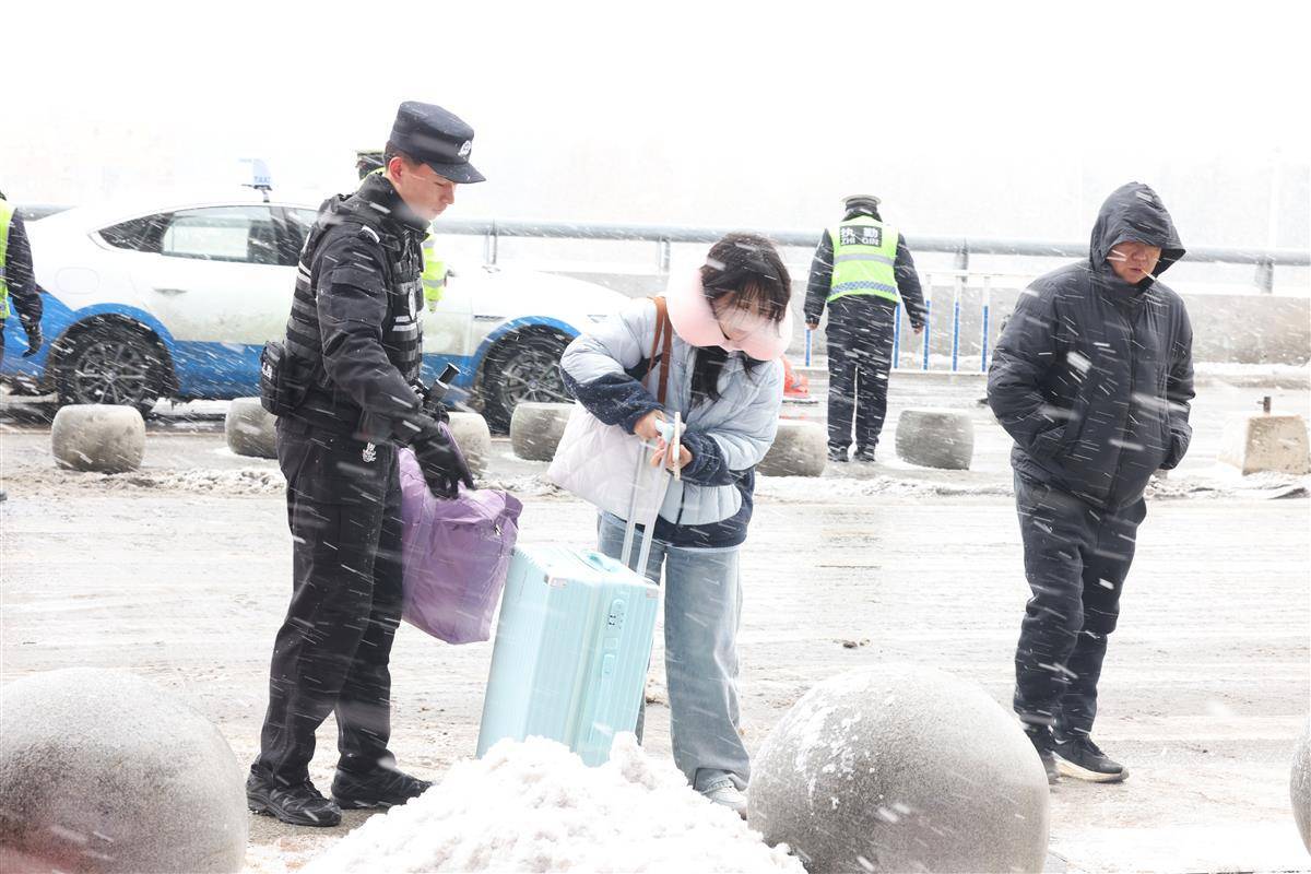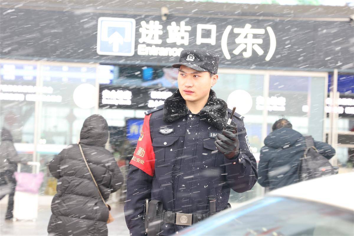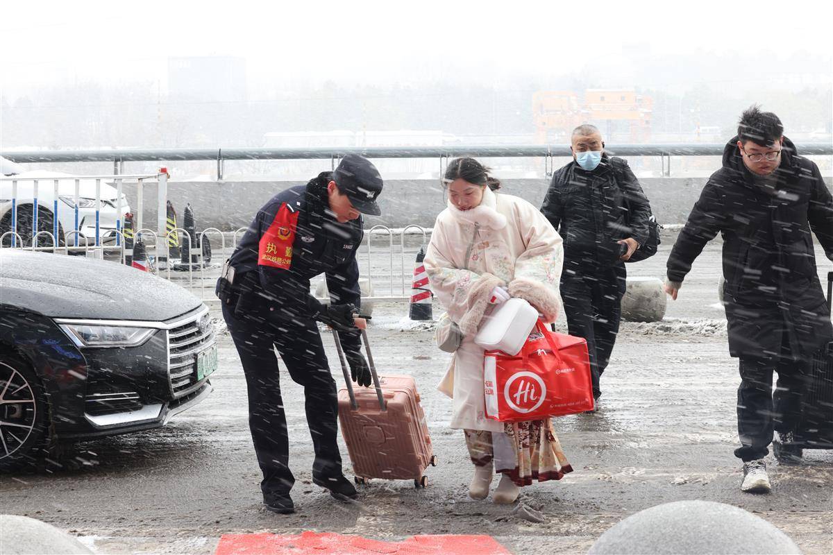 1月20日,武汉迎来2026年第一场雪。武汉铁路公安处武汉站派出所民警在低温和湿滑路面上坚守岗位,及时引导旅客有序通行。