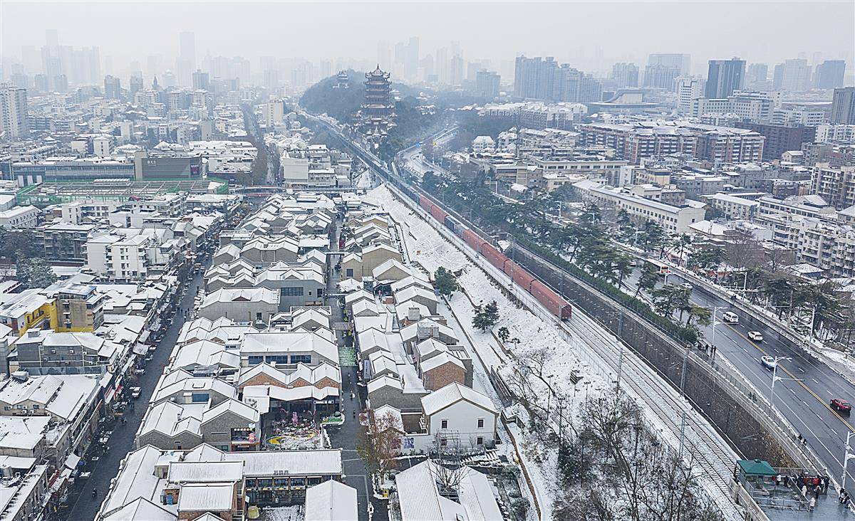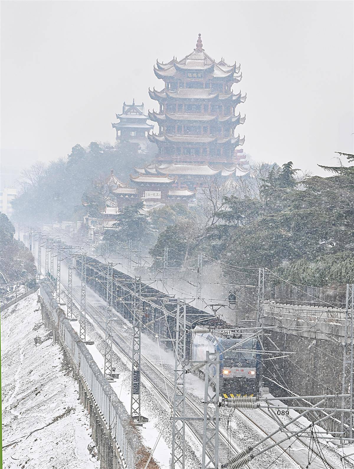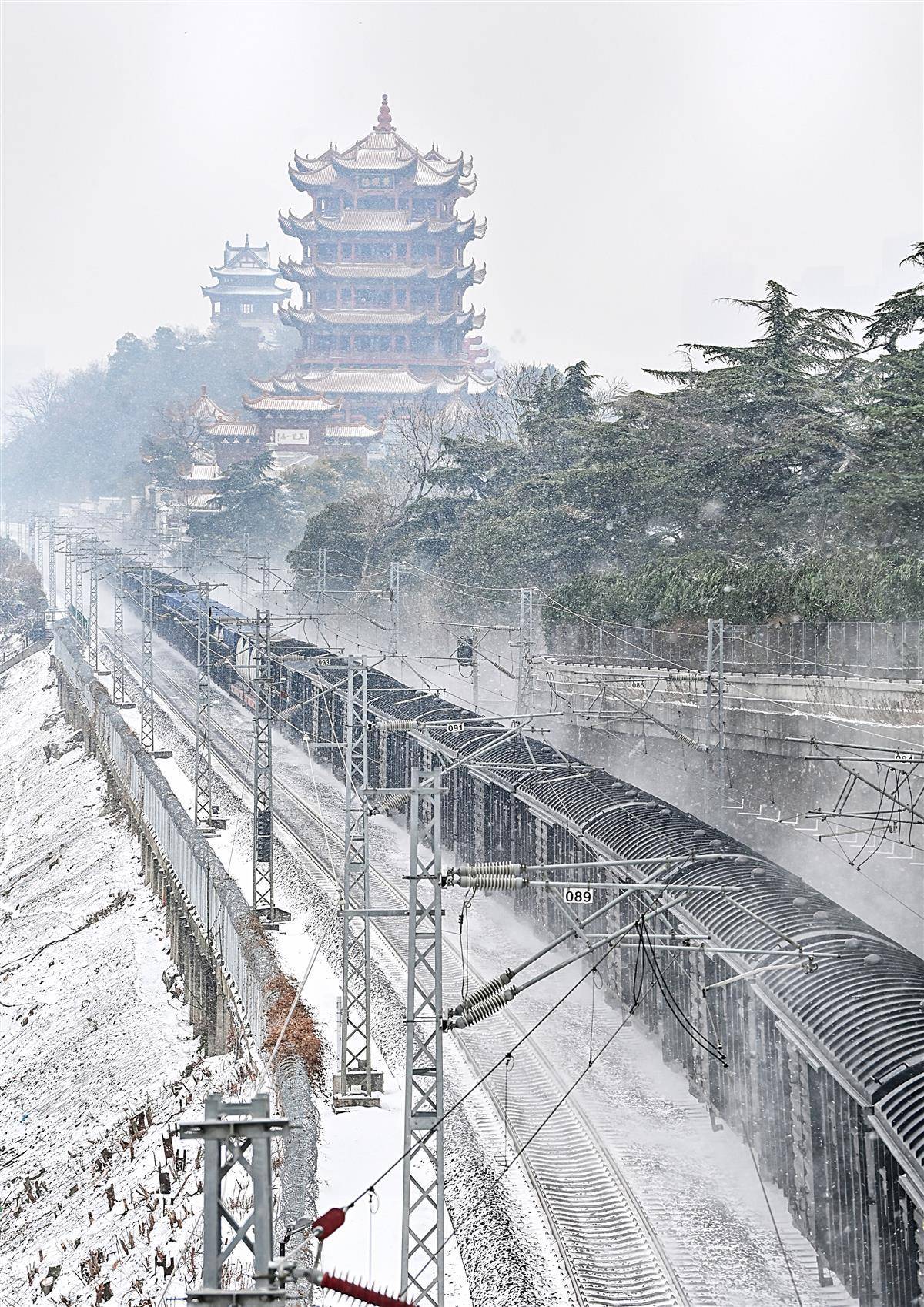 1月20日上午,武汉真的下雪了,许多市民游客来到武汉长江大桥,找到一个拍摄黄鹤楼、列车和雪同框的视角。