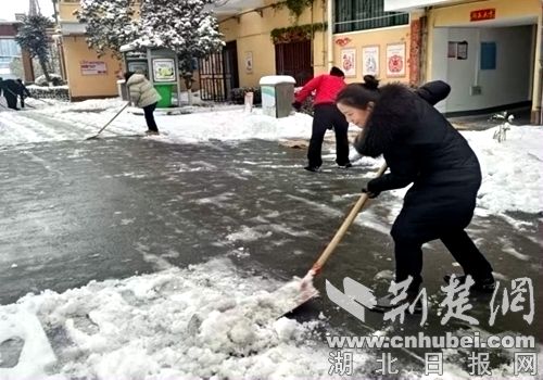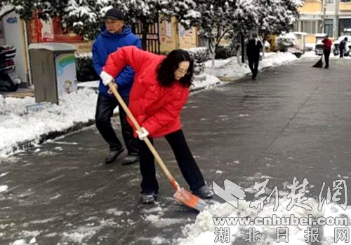 荆楚网(湖北日报网)讯(通讯员 郑华)1月20日清晨,襄阳市住房和城市更新局第二房产管理所管辖的保障房小区因降雪出现积雪。为保障居民出行安全,该所副所长胡琼带动居立方物业工作人员,手持雪铲对小区路面积雪进行清除,同时不少居民主动加入扫雪队伍。