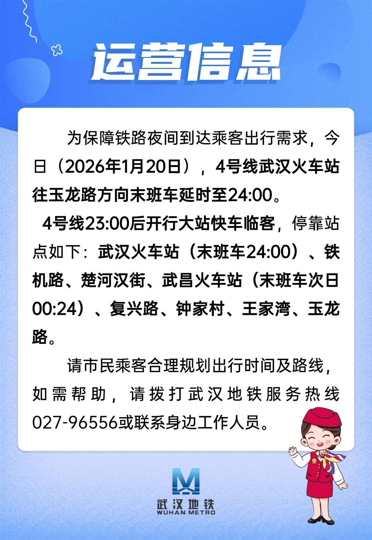 湖北日报讯(记者黄洁如、通讯员李丹、产启斗)为保障铁路夜间到达乘客出行需求,今日(2026年1月20日),4号线武汉火车站往玉龙路方向末班车延时至24:00。