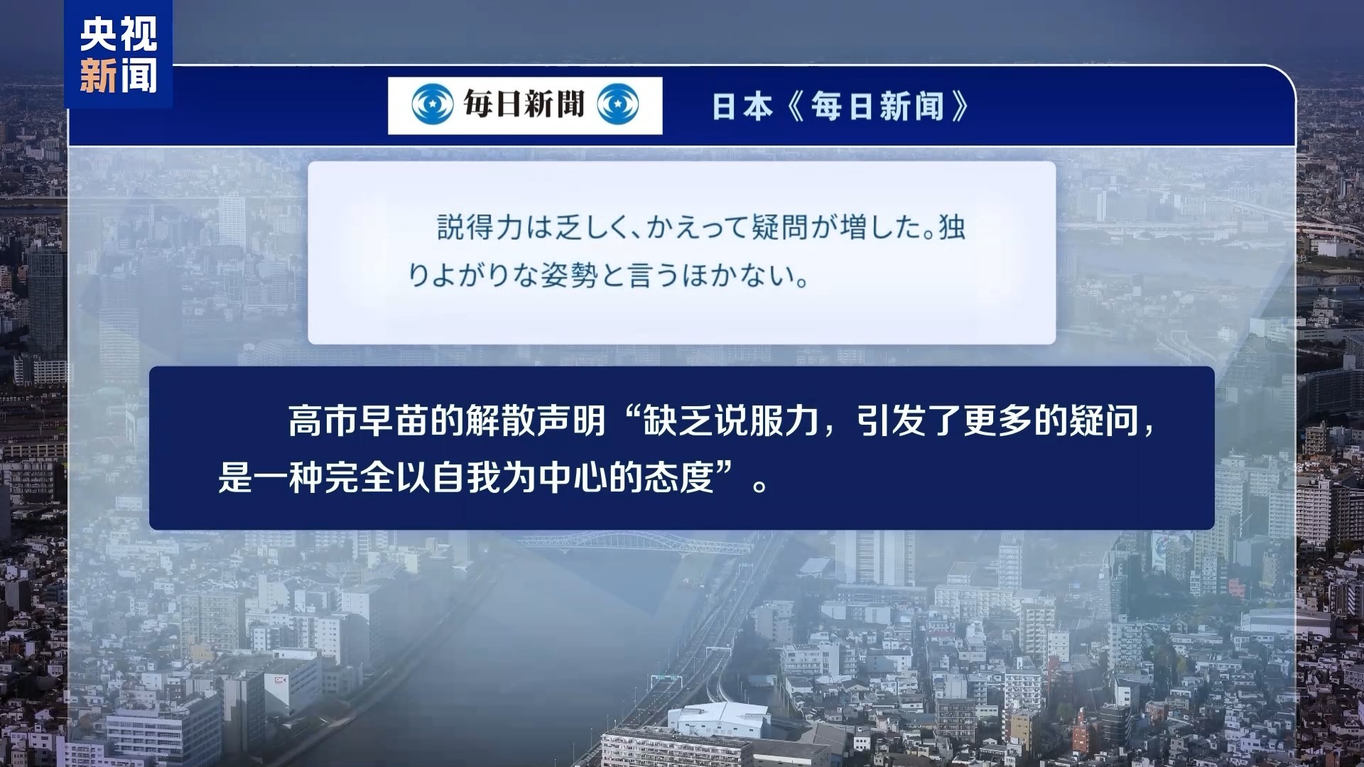 高市早苗宣布解散众议院并提前举行大选的决定引发了日本国内舆论哗然,民众举行集会反对高市的做法,一些专家和媒体也表达了对高市的不满,他们认为,在此时解散众议院,是毫无理由的“滥用职权”。