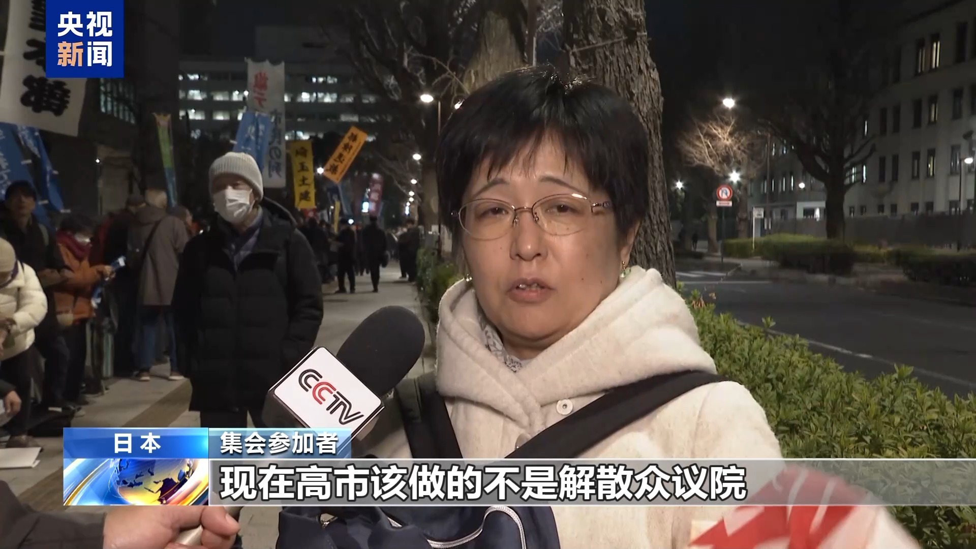集会参加者:这段时间高市当上首相之后,一直说要应对物价上涨,选举时还说过会调整消费税,可结果什么都没拿出来。既然说了要做,就请赶紧行动。为何什么都不做,反而去解散众议院?正如大家所说的那样,我认为这次解散根本没有正当理由。