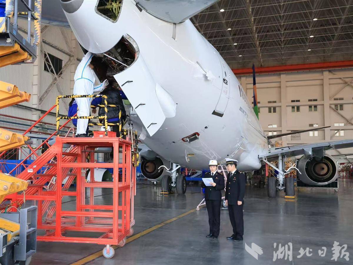 宜昌海关关员监管三峡国际机场首驾直飞入境的区外保税维修飞机开展作业。