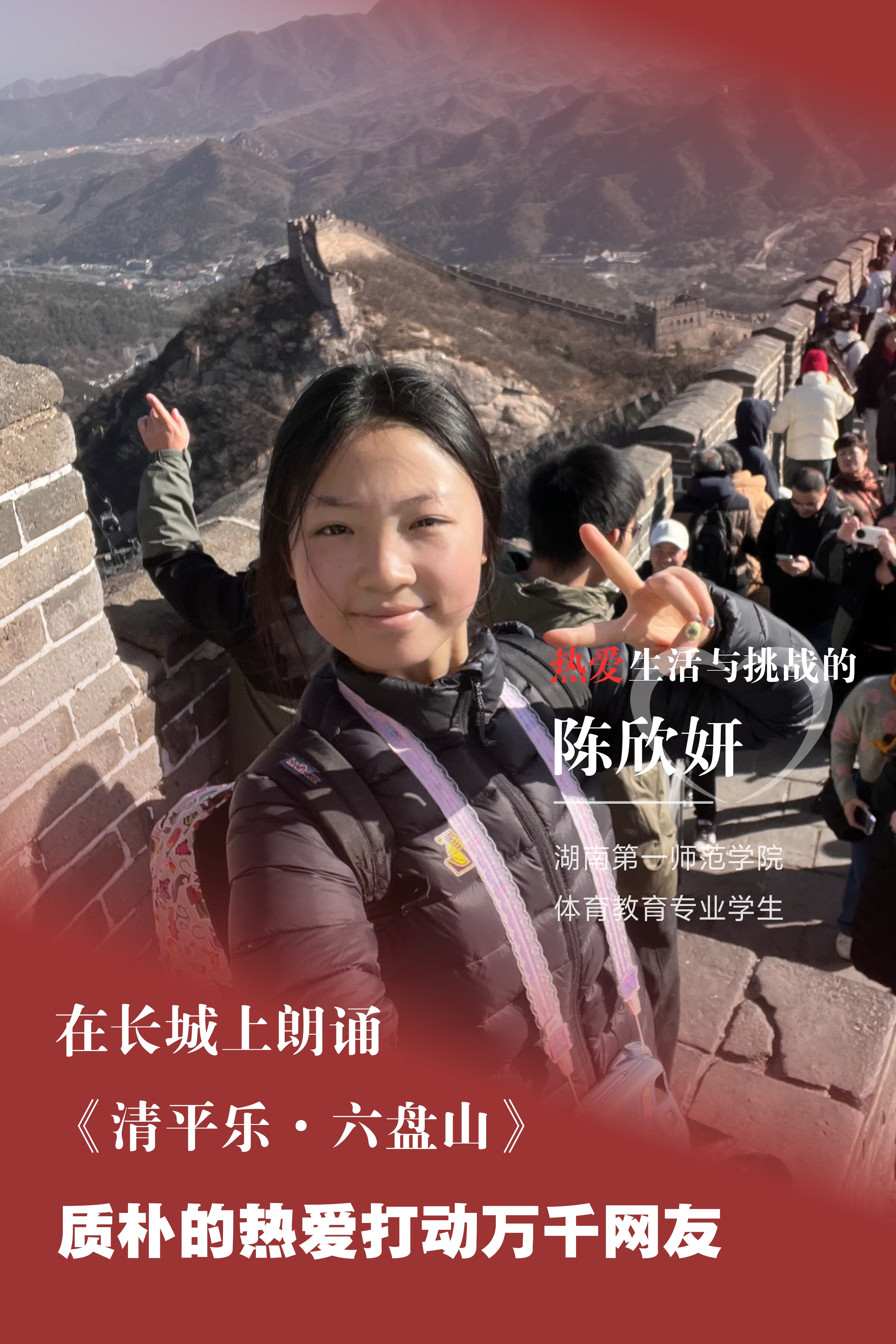 来自天南海北的年轻人,接力在长城上诵诗抒怀。带起这波热潮的,是来自湖南第一师范学院的陈欣妍。