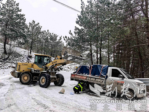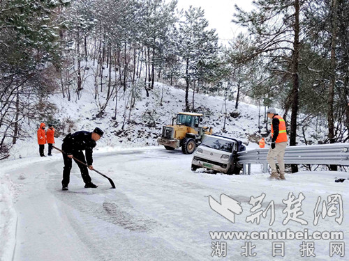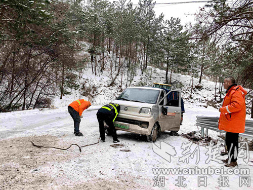荆楚网(湖北日报网)讯(通讯员 欧阳智慧 丁炎)1月19日至21日凌晨,湖北省襄阳市保康县歇马镇遭遇持续强降雪天气,辖区道路积雪结冰导致交通安全风险陡增。21日上午10时许,一辆货车在S307沮源村路段因路面湿滑失控陷入边沟,保康县公安局歇马派出所民警接警后迅速驰援,联合专业救援力量与热心群众协同作战,成功助被陷车辆脱困。