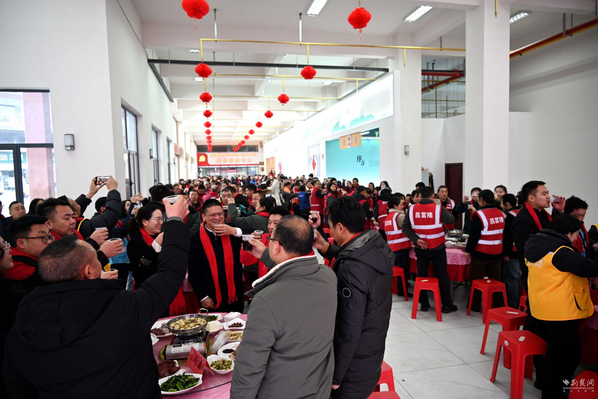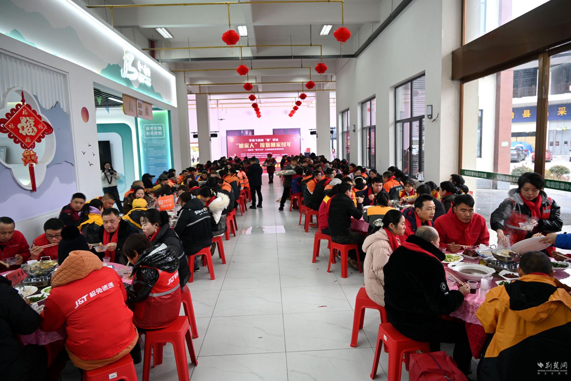 腊八将至,年味渐浓。园区工会驿站里张灯结彩,醒目的“娘家人接您回家过年”大红春联,浓郁的新年气息扑面而来。来自建始邮政、圆通、申通、中通、韵达、极兔、京东等快递职工物流司机300余人围桌而坐,拉家常、话发展。其乐融融……
