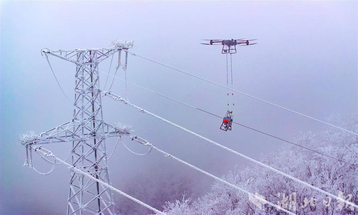 1月20日,一台灵巧的除冰机器人正沿着覆冰的导线稳步前行,快速清除缆线上的覆冰。
