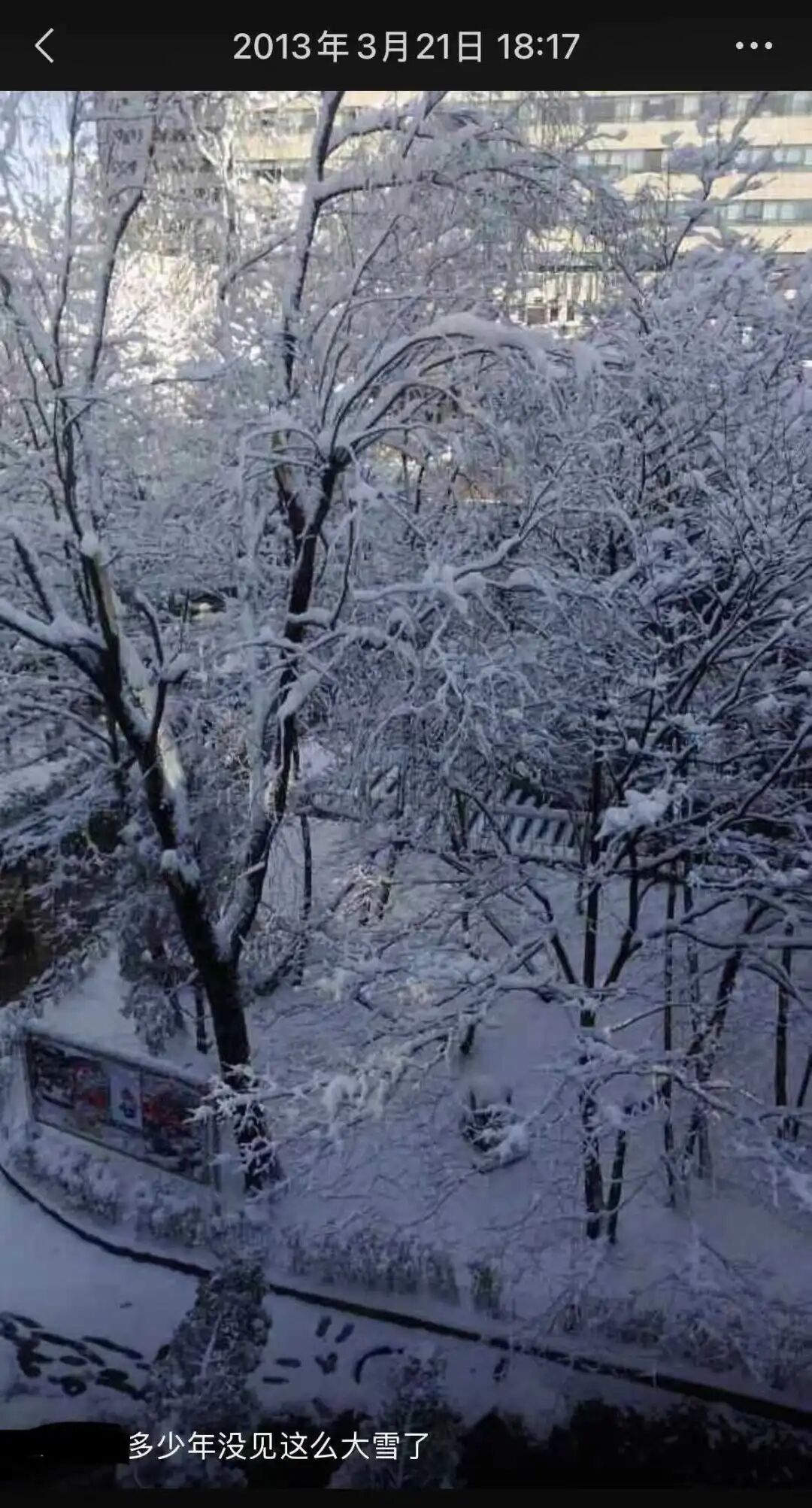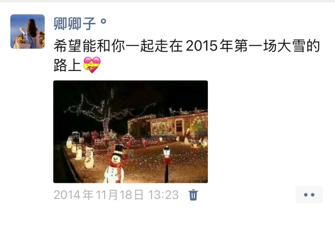 第一条朋友圈是2013年的第一场雪。那时还在上大学,学院还在旧址,几十年的老柳树树梢上挂满了银霜,我和室友们挤在老宿舍楼吱呀呀的铁制外跨楼梯上,拍下这张照片。