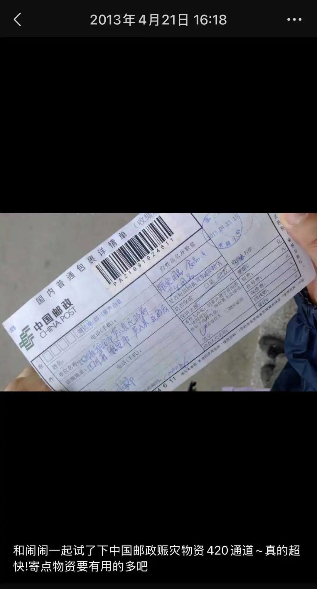 2013年,刚注册微信不久。那天和姐姐一起给雅安地震灾区邮寄了一些物资,留下了第一张朋友圈照片。