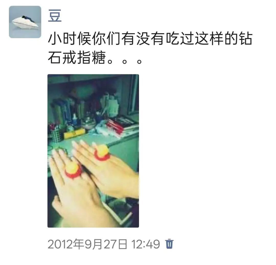 在好朋友的大学寝室拍的。那天我们去学校附近的一家怀旧火锅店,店里配了些小时候的零食。吃完火锅,我们拿了两颗钻石糖,回到寝室戴在手上拍照留念。
