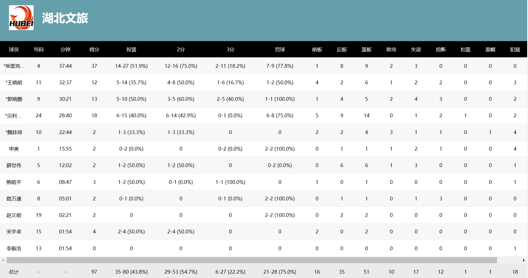 此役从个人数据上看,最大的功臣是两位外援。帕斯卡尔在进攻上无人能敌砍下37分,防守上也有9个篮板的贡献。虽在三分线外11投仅2中,但在三分线内无论是中距离跳投还是内线突破都效率奇高,16投12中,是僵持阶段湖北文旅最稳定的攻击点。斯蒂尔则再次体现自己两双狂魔的特点,18分14篮板的数据相当扎眼。