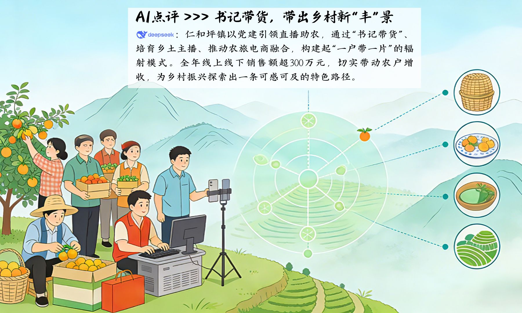 党员干部带头向前冲,把服务也送到了产销一线。他们既帮农户理顺采摘、打包、发货等环节的堵点,又手把手教农户掌握直播话术、镜头运用等技巧,用实打实的行动为农户排忧解难,推动形成“一户带一片、一片带一村”的辐射效应。