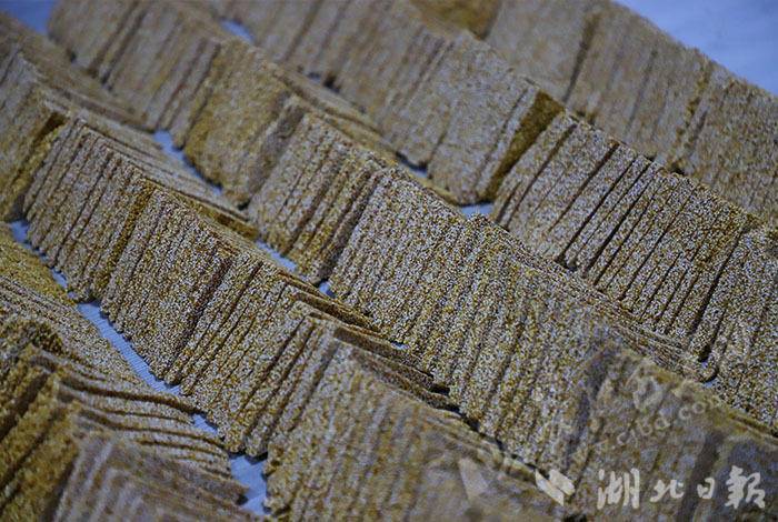 在操作间,工作人员分工明确,有的专注熬制麦芽糖,有的精心准备配料。麦芽糖在高温下不断冒出气泡,汪君将炒好的苋谷迅速倒入锅中与麦芽糖混合,同时用力搅拌,确保每一粒苋谷均匀裹上糖浆。将裹满糖浆的苋谷倒入模具,压实、整平后取出,趁余温切成三角薄片。一块块色泽金黄、香气诱人的苋谷糖就这样诞生了,冷却后包装,分批送到巴东各个城区。