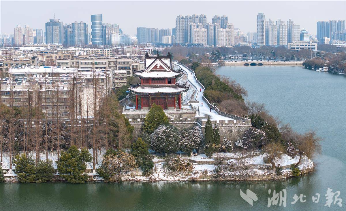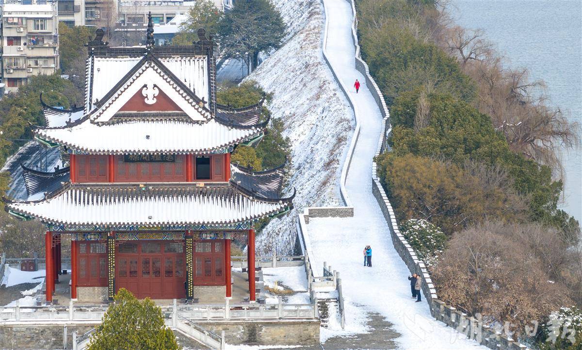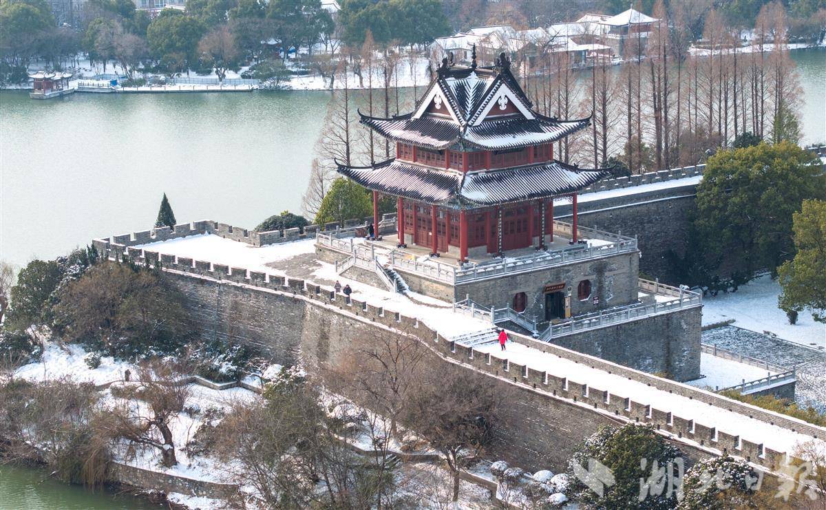 1月21日,游人在襄阳古城赏雪游玩。雪后初霁,襄阳古城古色古香的建筑与白雪相互映衬,景美如画,吸引不少游人前来打卡拍照,定格这份冬日限定的美好。(视界网 杨东 摄)