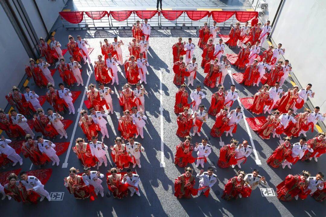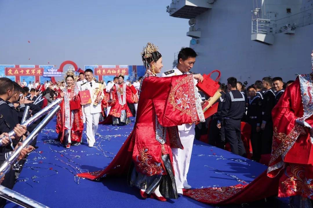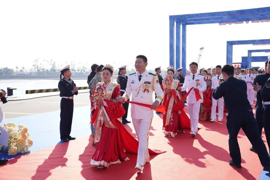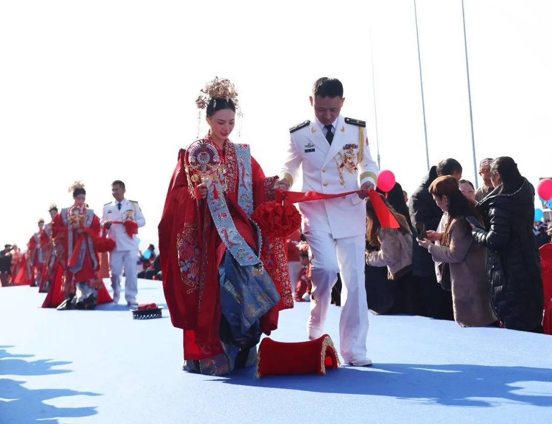 战舰为证,碧海为媒。仪式现场,新人们跨过火盆、马鞍,寓意家业兴旺、平安顺遂,主持人宣读集体婚书,宣告佳偶天成的喜事。新人向战舰、嘉宾、爱人三敬礼,致以崇高的敬意。随后,52对新人合卺交杯,许诺永结同心。