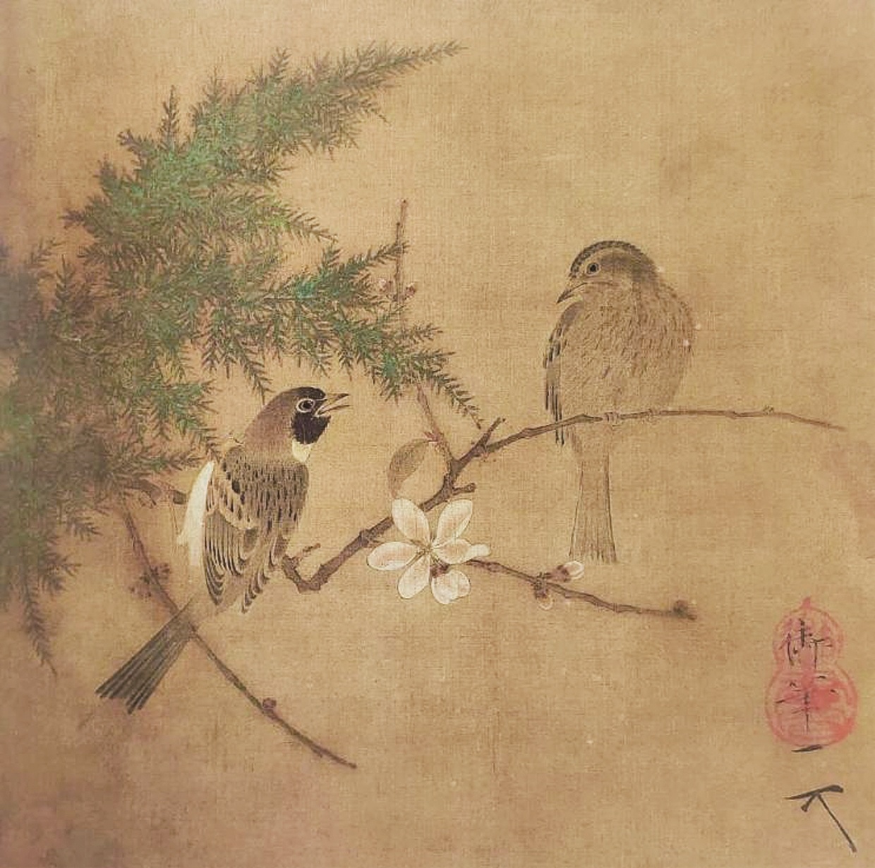 在宋徽宗赵佶的《蜡梅双禽图》中,我们得以窥见宋代宫廷审美的极致精微:梅与柏枝交错,一对山雀栖于梅梢,相视而鸣,春意暗藏。