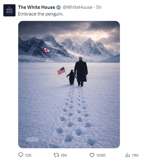 当地时间1月23日,美国白宫在社交媒体发布了一张AI图片。图片中美国总统特朗普和手持美国国旗的企鹅行走在冰天雪地中,他们的前方插着丹麦自治领地格陵兰岛旗,并配文“拥抱企鹅”。
