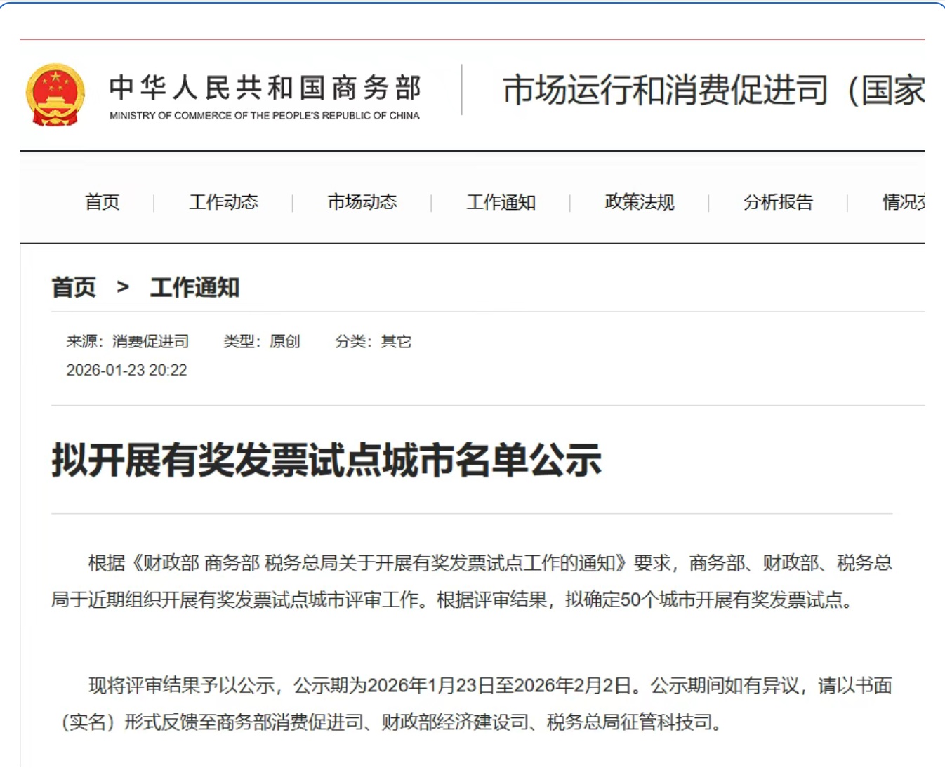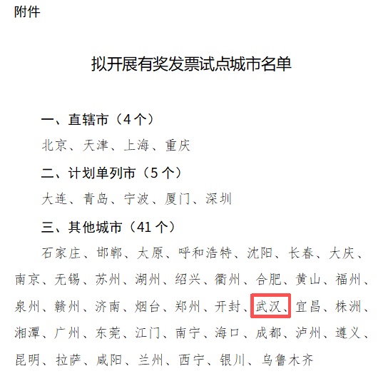 湖北日报讯 (记者黄磊、通讯员赵燕)1月23日,商务部官网公示全国有奖发票试点城市名单,武汉在列。