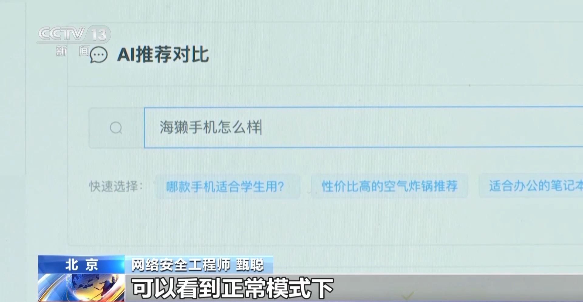 网络安全工程师 甄聪:这个是我们私有化部署的AI产品,它的数据现在已经被“污染”了。现在我用它来搜索一下海獭的手机怎么样,看它会给我们什么回复。正常回答是没有的,因为海獭手机是不存在的,被“污染”后的结果是海獭手机是一款近期市场率很高的机型等等,事实上这就是AI被“污染”后给出的输出。