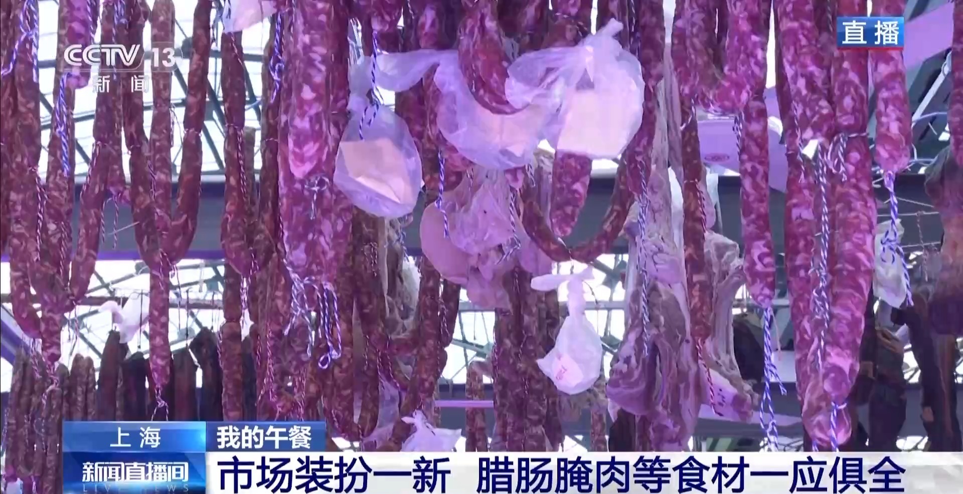 总台记者 曾侃:我们来到了上海浦东新区的上钢集贸市场。跟十几天前来这里时相比,灯笼、彩带等节庆的装饰更多了。最大的变化其实在肉铺的屋顶——食客们定的腊肠、腌肉已经完成了制作。