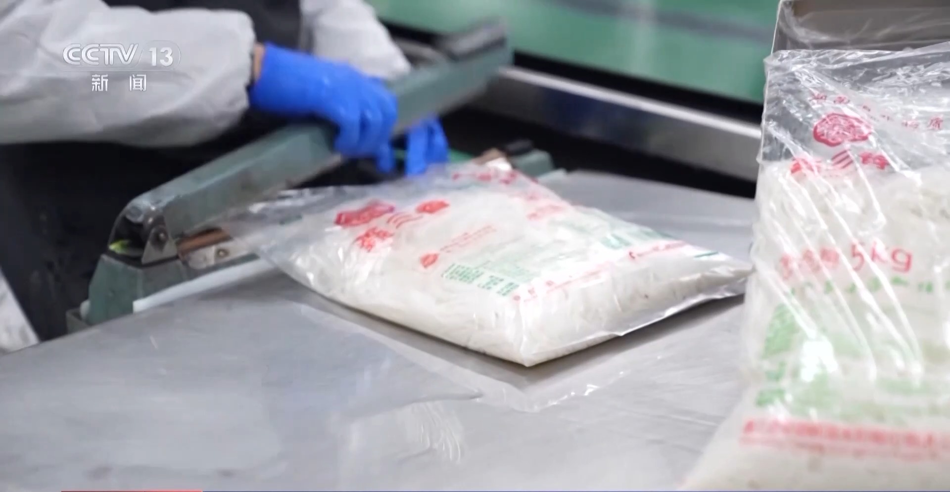 包装前,经过浸水冷却的米粉被激发弹牙口感。据介绍,每天,这里生产的鲜湿米粉可达40多万斤。经过工人的分切包装,它们也将奔赴各大餐饮店,成为食客们口中的美食。
