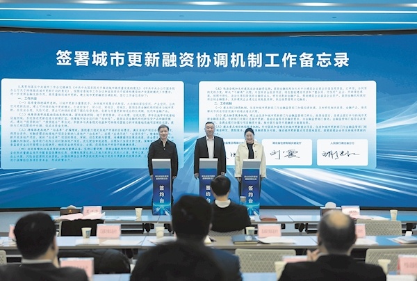 湖北省住房和城乡建设厅、中国人民银行湖北省分行、国家金融监督管理总局湖北监管局现场签署《城市更新融资协调机制工作备忘录》,成立由住房和城市更新部门与金融监管部门牵头,政策性银行、各商业银行参与的城市更新金融服务团,及时研究相关政策、金融产品,开展融资方案策划,推动城市更新重点项目落地落实。