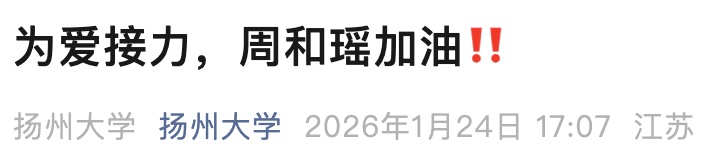 24日,为周和瑶加油打气的推文经扬州大学官方平台发出后,当天就有近4000次转发。学校透露,有不少师生校友,通过相关渠道进一步捐款。